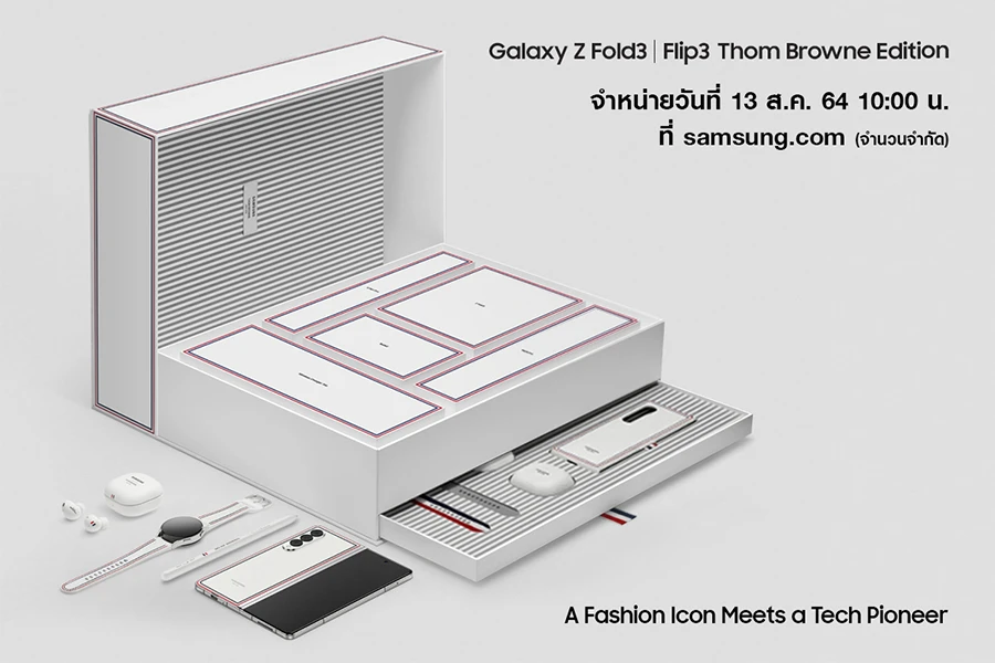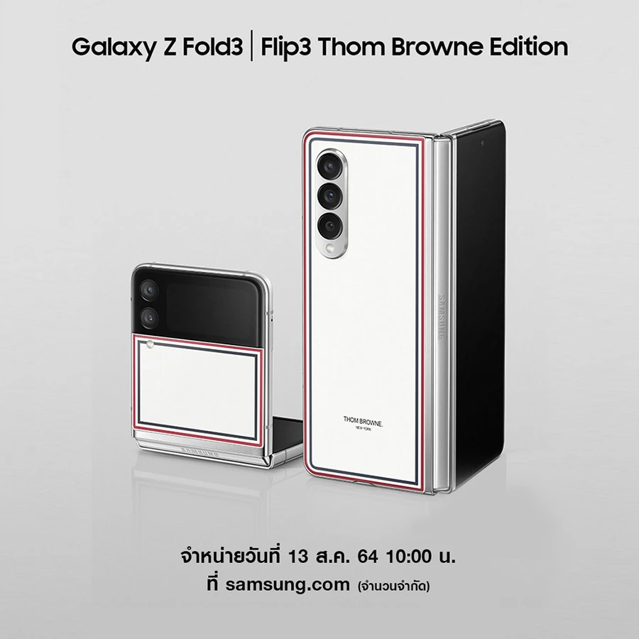 เปิดจำหน่าย Galaxy Z Fold3 | Flip3 Thom Browne Edition ในวันที่ 13 สิงหาคม 2564 เป็นต้นไป ผ่านทาง Samsung.com เพื่อรับเครื่องในวันที่ 27 สิงหาคม 2564 มีจำนวนจำกัดเพียง 100 เซ็ตต่อรุ่นเท่านั้น