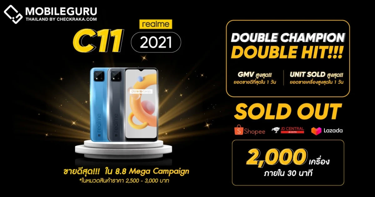 realme แบรนด์สมาร์ทโฟนเพื่อคนรุ่นใหม่ที่เติบโตเร็วที่สุดในโลก ประกาศความสำเร็จอีกขั้น บนช่องทาง E-Commerce อย่าง Shopee, JD Central และ Lazada ในแคมเปญ 8.8 Mega Campaign โดยกวาดยอดขายดีที่สุดและยอดขายเครื่องสูงสดใน 1 วัน นำขบวนโดย realme C11 2021 ที่ได้ขายหมดเป็นที่เรียบร้อย 2,000 เครื่องภายใน 30 นาที นับว่าเป็นสมาร์ทโฟนที่ขายดีที่สุดในหมวดราคา 2,500 – 3,000 บาท