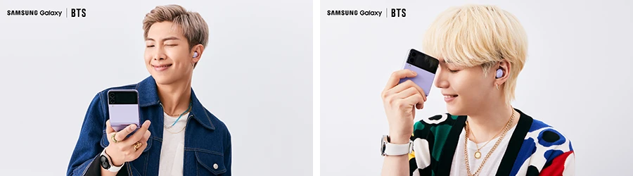 ใครว่าผู้ชายจะใช้สีพาสเทลไม่ได้! เพราะอาร์เอ็ม (RM) และชูก้า (SUGA) ลุคนี้ หล่อละมุนเข้ากับ Galaxy Z Flip3 5G และ Galaxy Buds2 สีม่วงลาเวนเดอร์มาก ยิ่งเมื่อมารวมกับความเก๋ของหน้าจอพับได้ที่ทำให้เซลฟี่ในมุมที่สนุกขึ้น ยิ่งทำให้ดูสดใส สะดุดตาสุดๆ