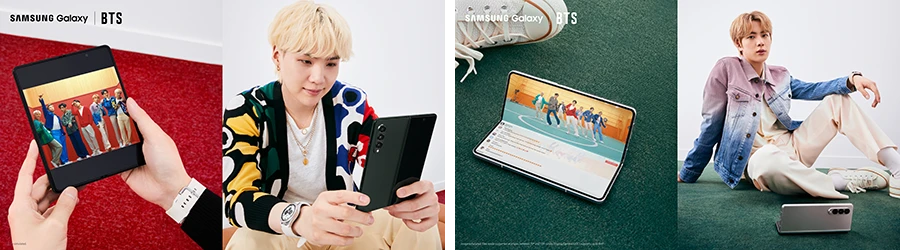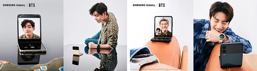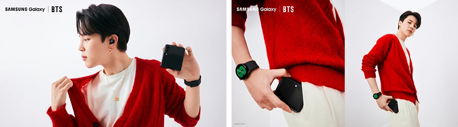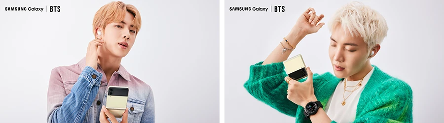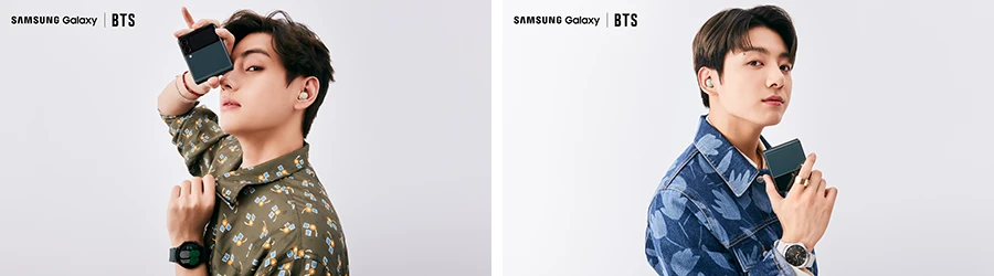 ส่วนวี (V) และจองกุก (Jungkook) มาพร้อมกับ Galaxy Z Flip3 5G สีเขียวที่สะท้อนเสน่ห์อันแปลกตา โดยเมื่อใส่เข้าคู่กับ Galaxy Buds2 สีเขียว Olive และ Galaxy Watch4 series สีดำหรือสีเงิน ก็อัพเลเวลความชิคขึ้นอีกหนึ่งขั้นทันที โดยสำหรับสายโซเชียลยิ่งควรมีสมาร์ทโฟนรุ่นนี้ เพราะสามารถวิดีโอคอลหาเพื่อนได้แบบชิลๆ โดยไม่ต้องใช้มือจับสมาร์ทโฟนไว้ตลอด หรือหาที่พิง ทีนี้แม้คุยนานแค่ไหนก็ไม่เป็นปัญหาอีกต่อไป