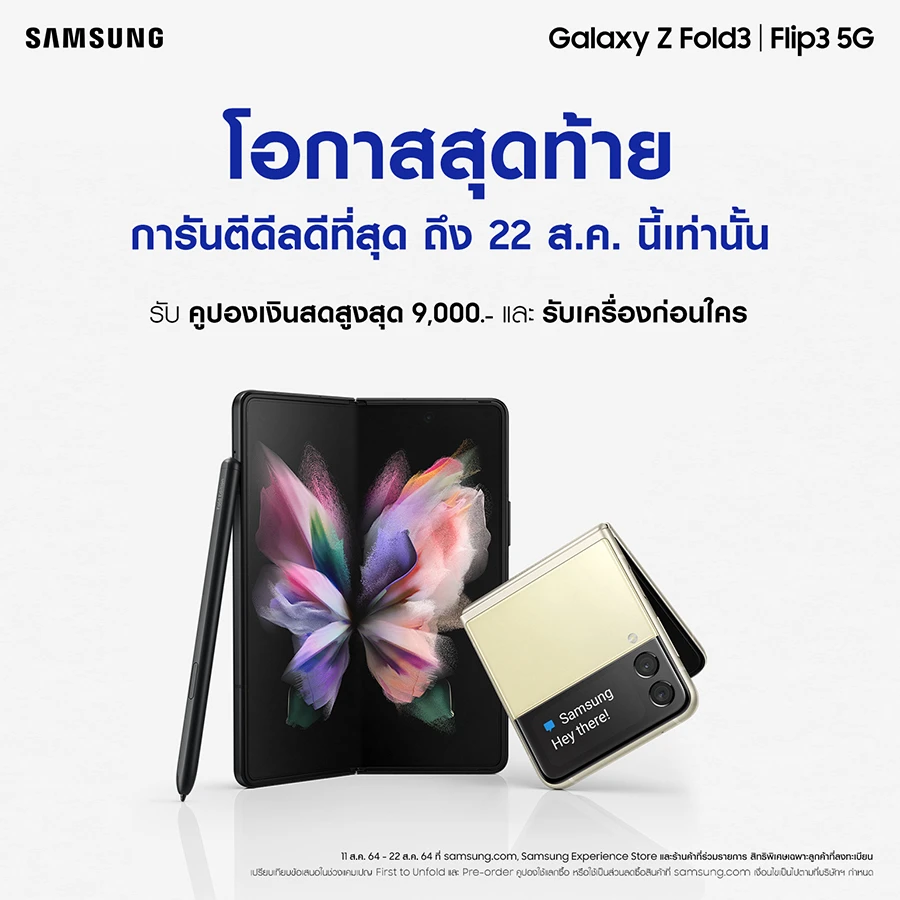 โอกาสสุดท้าย จองเป็นเจ้าของ Galaxy Z Fold3 5G และ Galaxy Z Flip3 5G พร้อมการันตีดีลที่ดีที่สุดได้ ภายในวันที่ 22 สิงหาคมนี้เท่านั้น เพื่อรับคูปองเงินสดสูงสุด 9,000 บาท พร้อมรับเครื่องก่อนใครในวันที่ 2 กันยายนเป็นต้นไป ทาง www.samsung.com/th/zfold3/buy และ www.samsung.com/th/zflip3/buy
