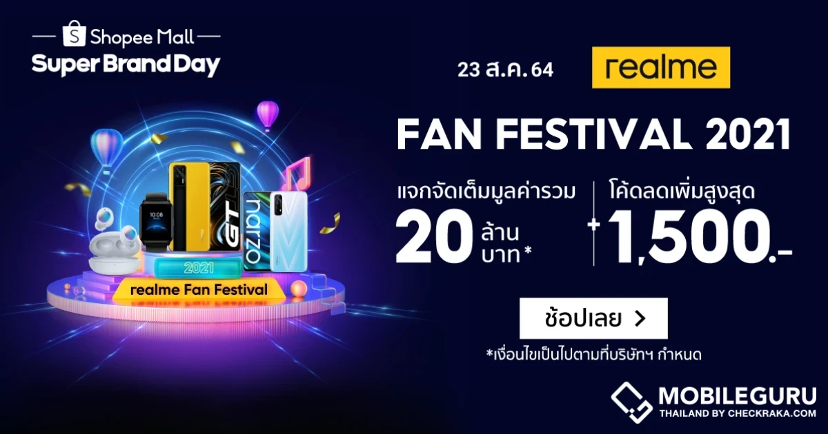 realme ร่วมกับ Shopee จัดแคมเปญสุดพิเศษ 'realme Fan Fest X Super Brand Day' ลดสูงสุด 50% + โค้ดลดเพิ่มสูงสุด 1,500 บาท พร้อมรับของสมนาคุณรวมมากว่า 20 ล้านบาท และสิทธิพิเศษสุดคุ้มค่าอีกมากมายเมื่อชำระเงินผ่าน ShopeePay ระหว่างวันที่ 23 - 25 สิงหาคม 2564 กับช่องทาง realme Official Store บน Shopee Mall เท่านั้น