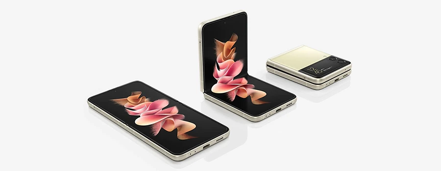 Galaxy Z Flip3 5G สมาร์ทโฟนที่รวมฟังก์ชันและแฟชั่นมาไว้ในเครื่องเดียว มีให้เลือกถึง 4 สี ครีม ดำ เขียว ม่วง เมื่อพับแล้วมีขนาดเล็กกะทัดรัด พกพาใส่กระเป๋าได้สะดวก และยังมาพร้อมจอด้านนอกที่ใหญ่กว่ารุ่นก่อนถึง 4 เท่า ทำให้เช็คข้อความต่างๆ ได้ง่ายโดยไม่ต้องกางเครื่องออก พร้อมตั้งถ่ายภาพทั้งเซลฟี่และกรุ๊ปช็อตได้แบบแฮนด์ฟรี เหมือนมีขาตั้งกล้องส่วนตัว โดยมาในราคาเริ่มต้น 34,900 บาท