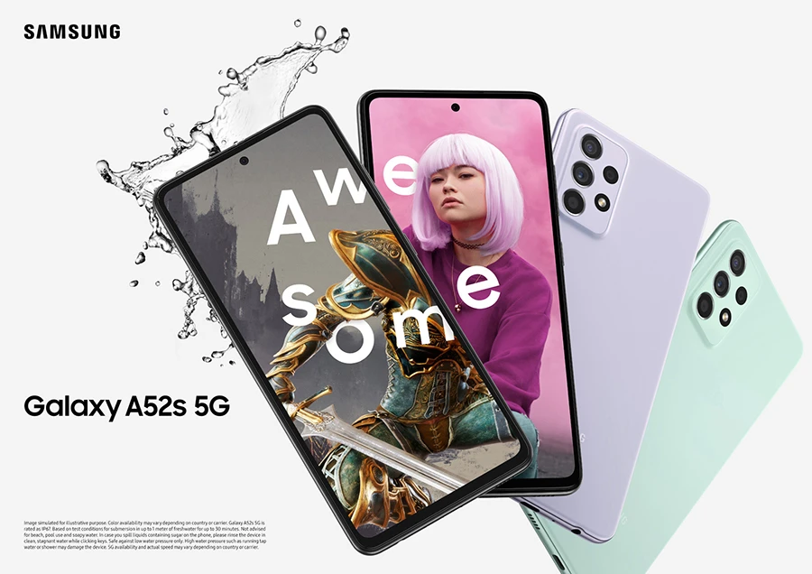 เมื่อต้นปีที่ผ่านมา ซัมซุงได้สร้างมาตรฐานใหม่ให้กับตลาดสมาร์ทโฟนระดับกลางด้วยการนำเสนอคุณสมบัติกันน้ำและฝุ่นเป็นครั้งแรกในรุ่น Galaxy A72 และ A52 ซึ่งเป็นฟังก์ชันที่ผู้บริโภคส่วนใหญ่ต้องการ เช่นเดียวกับ Galaxy A52s 5G รุ่นใหม่นี้ ที่มาพร้อมประสิทธิภาพกันน้ำและฝุ่นระดับ IP67 จึงใช้งานได้อย่างอุ่นใจ หมดกังวลหากน้ำหกใส่หรือจำเป็นต้องใช้ขณะฝนตก