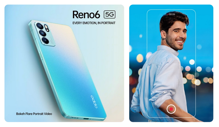 OPPO Reno6 5G รุ่นล่าสุดยังคงมาในสโลแกน “อารมณ์ไหน ก็พอร์ตเทรต” แต่เผยมาแล้วว่าจะมีการอัปเกรดฟีเจอร์พอร์ตเทรตที่ล้ำไปอีกขั้นด้วย Bokeh Flare Portrait Video ครั้งแรกของการถ่ายวิดีโอพอร์ตเทรตแบบเบลอแสงให้เป็นโบเก้ได้อย่างสวยงามและทำได้แบบแบบเรียลไทม์ รวมถึงยังถ่ายภาพพอร์ตเทรตให้เต็มเปี่ยมไปด้วยอารมณ์เหมือนเช่นเคย นอกจากเทคโนโลยีกล้องที่จัดเต็มสมฐานะผู้นำด้านการถ่ายพอร์ตเทรตแล้ว ด้านดีไซน์ได้มีการออกแบบใหม่ให้มีความบางเบาและพรีเมี่ยมมากยิ่งขึ้น แต่ยังคงเอกลักษณ์ตามแบบฉบับของ OPPO Reno Series นอกจากนี้ยังจัดหนักอัดแน่นสเปคครบทุกการใช้งาน พร้อมเชื่อมต่อ 5G เพื่อประสบการณ์การใช้งานที่สุดยอด ในดีไซน์สวยล้ำไม่เหมือนใคร
