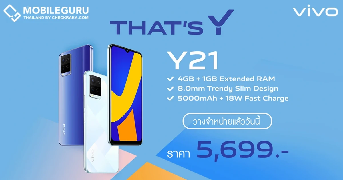 vivo Y21 RAM 4GB + ROM 64GB พร้อมวางจำหน่ายอย่างเป็นทางการแล้วตั้งแต่วันนี้เป็นต้นไป ที่ราคา 5,699 บาท ณ vivo Brand Shop ทุกสาขา ตัวแทนจำหน่ายทั่วประเทศ ผู้ให้บริการเครือข่าย และช่องทางออนไลน์ vivo Official Store