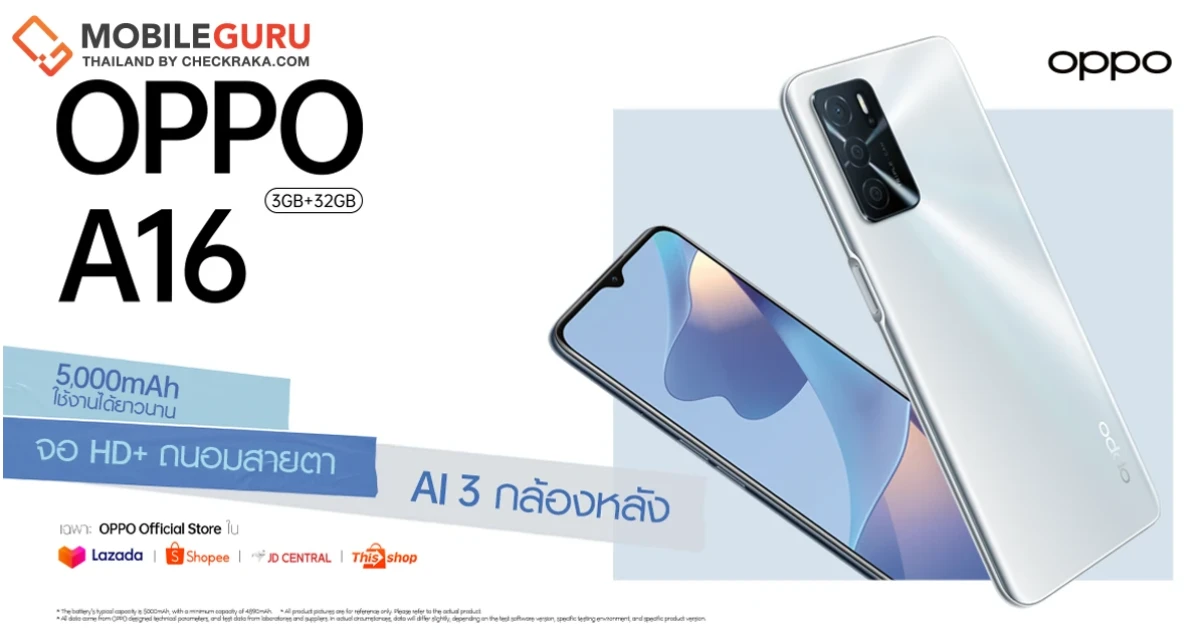 OPPO A16 รุ่น RAM 3GB + ROM 32GB พร้อมวางจำหน่ายบนทุกช่องทางออนไลน์! ในราคา 4,799 บาท
