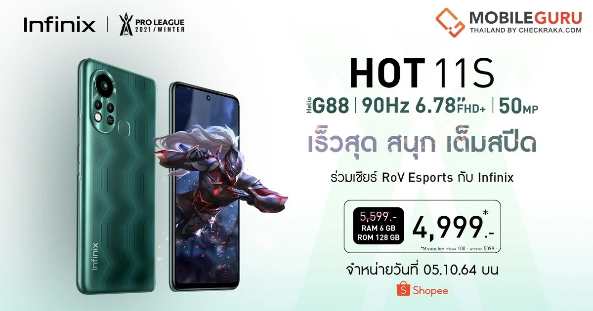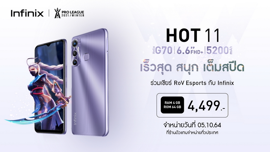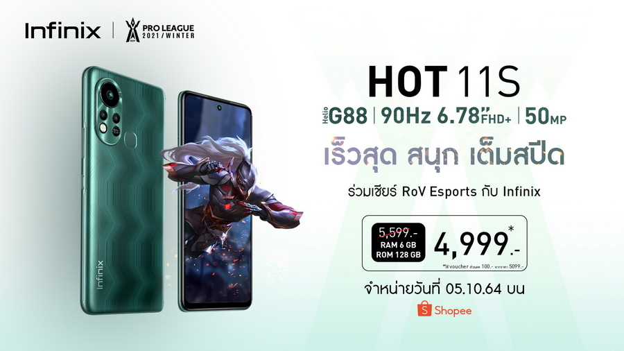 อินฟินิกซ์ (Infinix) แบรนด์สมาร์ตโฟนระดับโลกที่ประสบความสำเร็จและได้รับความนิยมเ ป็นอย่างมากทั้งในต่างประเทศและประเทศไทย เปิดตัวสมาร์ตโฟนรุ่นใหม่ล่าสุด Infinix HOT 11 Series ที่มาพร้อมกับสโลแกน “Fast and Fun – เร็วสุด สนุกเต็มสปีด” อีกหนึ่งรุ่นที่จะมารุกตลาดสมาร์ตโฟนสายเกมราคาประหยัด โดยรอบนี้ยังคงเข้าร่วมเป็นผู้สนับสนุน RoV Proleague Winter 2021 เช่นเคย ซึ่งรุ่นท็อปอย่าง HOT 11S โดดเด่นด้วยชิปเซ็ตคู่ทรงพลัง MediaTek Helio G88 ผสานกับหน้าจอขนาดใหญ่เต็มตา 6.78 นิ้ว FHD+ พร้อมรีเฟรชเรท 90Hz เพื่อตอบโจทย์การเล่นเกมที่ดีที่สุด มอบประสบการณ์การรับชมความบันเทิงรูปแบบต่างๆ ได้ครบครันที่สุด รวมถึงการถ่ายภาพที่ทำได้อย่าง มืออาชีพ ด้วยความละเอียดกล้องสูงสุด 50MP ในราคาสุดคุ้ม 5,299 บาท กำหนดวางจำหน่ายแบบ เอ็กซ์คลูซีฟบน Shopee เริ่มตั้งแต่วันที่ 5 ตุลาคมนี้ เป็นต้นไป