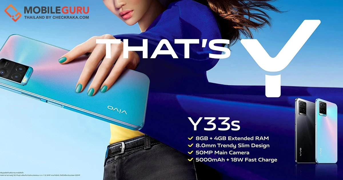 vivo แบรนด์สมาร์ตโฟนชั้นนำระดับโลก เปิดตัว vivo Y33s สมาร์ตโฟนรุ่นใหม่ล่าสุด สเปกครบครัน มาพร้อมความแรงให้ใช้งานอย่างลื่นไหลด้วย 8GB + 4GB Extended RAM และหน้าจอใหญ่เต็มตาขนาด 6.58 นิ้วกล้องหลังความละเอียด 50MP จัดเรียงแบบ Dual Tone Step เอกลักษณ์เฉพาะตัวของ vivo ใช้งานได้ต่อเนื่องยาวนานตลอดทั้งวันด้วยแบตเตอรี่ความจุ 5000 mAh รองรับเทคโนโลยีชาร์จไว 18 วัตต์ ดีไซน์ตัวเครื่องบางเพียง 8 มม. พกพาสะดวก พร้อมตัวเลือก 2 สีใหม่ บ่งบอกสไตล์ได้ชัดเจน ทั้ง Mirror Black และ Midday Dream ตอบโจทย์ทุกการใช้งานพร้อมให้ทุกคนสนุกได้แบบ That’s Y ในราคา เพียง 7,999 บาท
