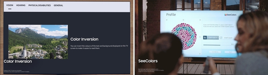 ซัมซุงเข้าใจระดับและความต้องการที่แตกต่างกันของผู้บกพร่องทางการมองเห็น ส่งผลให้ซัมซุงได้พัฒนาฟีเจอร์ Color Inversion ที่สามารถเปลี่ยนสีเมนูเป็นให้เป็นพื้นหลังสีดำและเปลี่ยนภาพสีให้เป็นสีขาวดำได้ เพื่อความสบายตาสำหรับผู้ที่มีดวงตาไวต่อแสง อีกทั้งยังใส่ใจผู้ที่มีอาการตาบอดสีด้วย SeeColors App ให้ผู้ใช้ระบุชนิดของภาวะตาบอดสีและระดับความรุนแรงได้ เพื่อปรับการแสดงผลบนหน้าจอให้ผู้ใช้สามารถเห็นภาพได้ใกล้เคียงความสมจริงที่สุด