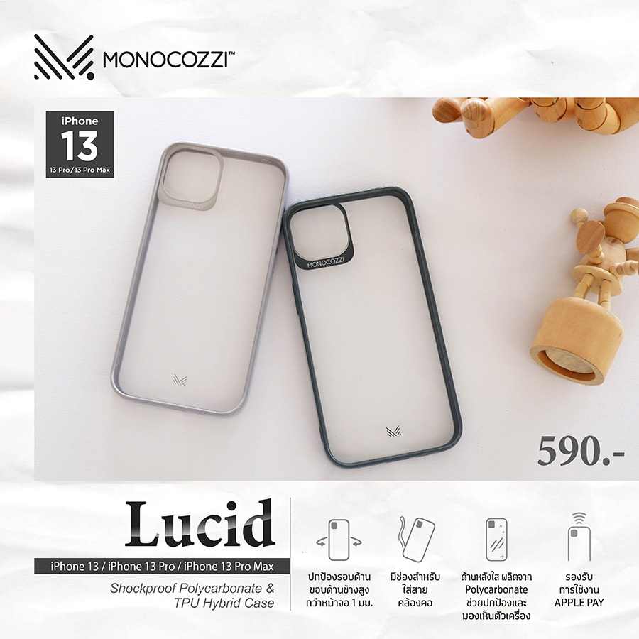 สำหรับเคสรุ่น LUCID Shockproof Polycarbonate & TPU Hybrid Bumper เป็นเคสแบบด้านหลังใสที่ได้รับการออกแบบมาเป็นพิเศษ มาพร้อม Bumper TPU แบบ Hybrid ที่จะช่วยป้องกันแรงกระแทกและป้องกันฝุ่นได้อย่างยอดเยี่ยม ด้วยการออกแบบที่เรียบง่าย ในขณะที่มุมด้านล่างตัวเคสดีไซน์ให้มีรูสำหรับสายคล้องโทรศัพท์เพื่อความสะดวกสบายในการใช้งานได้อย่างลงตัว โดย LUCID Shockproof Polycarbonate & TPU Hybrid Bumper สามารถรองรับ iPhone 13 Mini, iPhone 13, iPhone 13 Pro และ iPhone 13 Pro max วางจำหน่ายแล้ววันนี้ในราคา 590 บาท