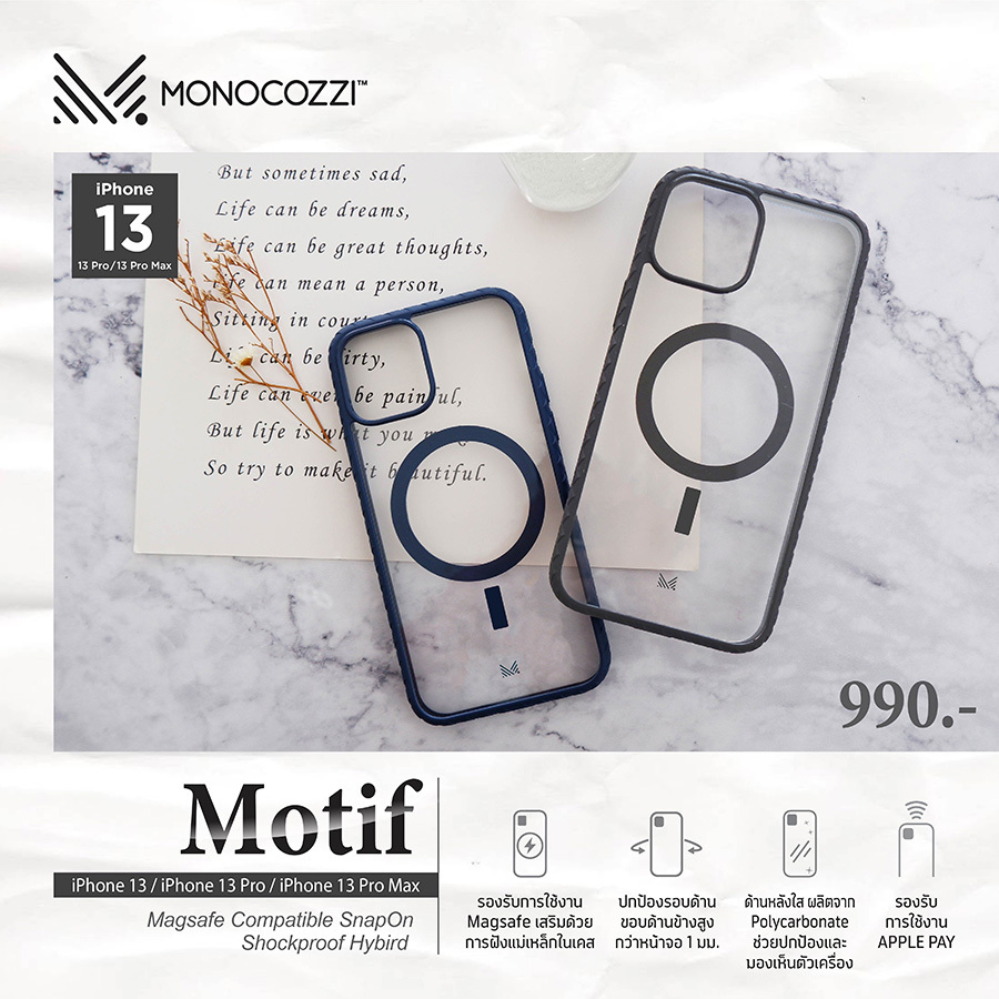 ในขณะที่เคสรุ่น MOTIF Magsafe Compatible SnapOn Shockproof Hybrid Case เป็นเคสแบบด้านหลังใสที่ช่วยในการมองเห็นตัวเครื่องได้อย่างชัดเจน มาพร้อม Bumper TPU แบบ Hybrid ที่จะช่วยป้องกันแรงกระแทกและป้องกันฝุ่นได้อย่างยอดเยี่ยม ด้วยการออกแบบที่เรียบง่ายสามารถรองรับการใช้งาน Magsafe ชาร์จแบบไร้สาย สำหรับ iPhone 13 ที่เสริมด้วยการฝังแม่เหล็กไว้ในเคสได้อย่างลงตัว โดย MOTIF Magsafe Compatible SnapOn Shockproof Hybrid Case สามารถรองรับ iPhone 13, iPhone 13 Pro และ iPhone 13 Pro Max วางจำหน่ายแล้ววันนี้ในราคา 990 บาท
