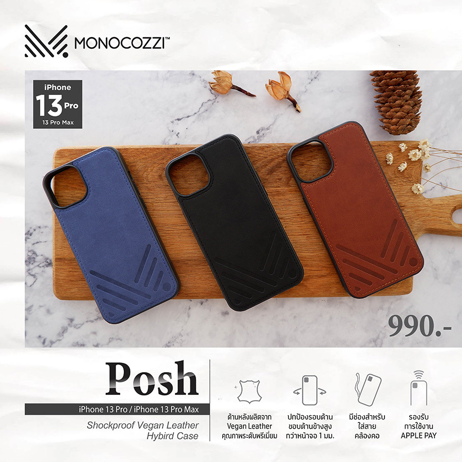 ในส่วนเคสรุ่น POSH Shockproof Vegan Leather Hybrid Case เป็นเคสคุณภาพระดับพรีเมี่ยมที่ด้านหลังผลิตจาก Vegan Leather หนังคุณภาพดีที่เป็นมิตรต่อสิ่งแวดล้อม ซึ่งมาพร้อม Bumper TPU แบบ Hybrid ที่จะช่วยป้องกันแรงกระแทกและป้องกันฝุ่นได้อย่างยอดเยี่ยม โดยเคสรุ่น POSH Shockproof Vegan Leather Hybrid Case สามารถรองรับ iPhone 13, iPhone 13 Pro และ iPhone 13 Pro Max วางจำหน่ายแล้ววันนี้ในราคา 990 บาท