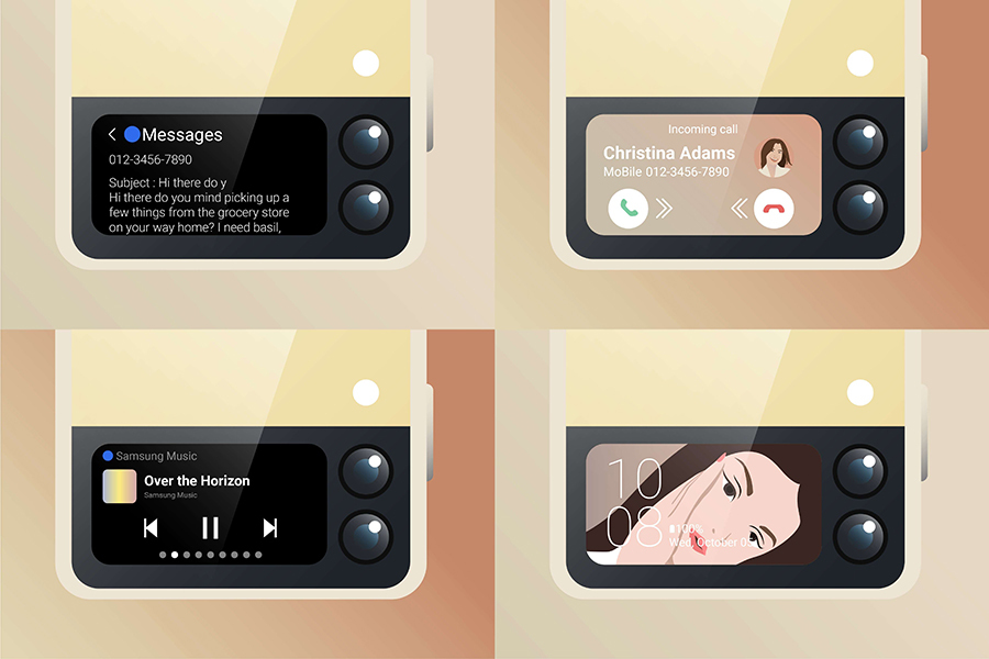 นอกจากจะถ่ายรูปโดยไม่ต้องกางสมาร์ทโฟนแล้ว เจ้าจอ Cover Screen จิ๋วแต่แจ๋วขนาด 1.9 นิ้วด้านนอกยังทำอะไรได้อีกเยอะเพราะไม่ใช่แค่ดูการแจ้งเตือนที่เด้งขึ้นมาแบบธรรมดา แต่ยังสามารถกดอ่านข้อความแบบเต็มจากการแจ้งเตือนนั้นๆ ได้เลย พร้อมทั้งยังสามารถตอบข้อความด้วยการกดเลือกคำสั้นๆ ได้อีกด้วย เวลามีสายโทรเข้าก็กดรับหรือปฏิเสธผ่านจอ Cover Screen ได้ทันที รวมถึงควบคุมเพลงที่กำลังเล่น หรือแม้กระทั่งตั้งค่าหูฟัง Galaxy Buds ที่เชื่อมต่อกันโดยไม่ต้องกางหน้าจอ