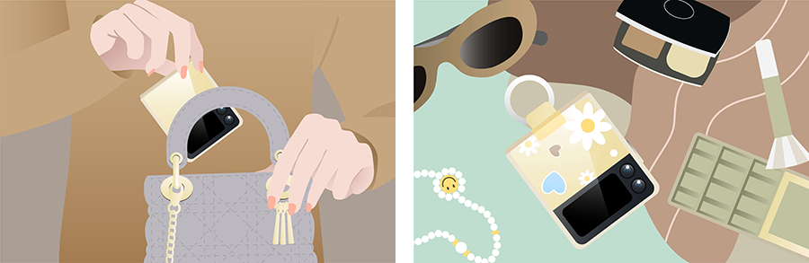 Micro-Bag กลายเป็นหนึ่งในแฟชั่นไอเท็มของยุคนี้ที่เหล่าแฟชั่นนิสต้าต้องมี ด้วยไซส์ปุ๊กปิ๊กน่ารักน่าเอ็นดูเหมือนเป็นเครื่องประดับที่ช่วยฟินิชลุคให้สมบูรณ์แบบ แต่เชื่อว่าปัญหาที่หลายคนเคยเจอคือน้องกระเป๋าไมโครเสียจนใส่ของได้น้อยมาก แต่จะไม่พกสมาร์ทโฟนก็ไม่ได้จนต้องยอมถือไว้ในมือแทนเพื่อที่จะได้สะพายเจ้ากระเป๋าใบจิ๋ว แต่ต่อจากนี้เราก็ไม่จำเป็นต้องเลือกระหว่างแฟชั่นกับฟังก์ชั่นอีกต่อไป เพราะด้วยดีไซน์กะทัดรัดของ Galaxy Z Flip3 5G ทำให้สามารถพกพาสมาร์ทโฟนติดตัวไปได้ทุกที่แบบไม่ต้องคอยถือให้เกะกะ จะใส่ Micro-Bag กระเป๋ากางเกง กระเป๋าเสื้อเชิ้ต หรือเหน็บเข็มขัดก็ทำได้แบบเก๋กรุบ