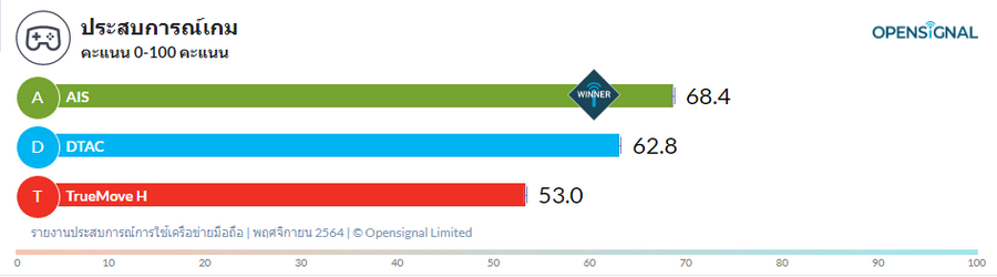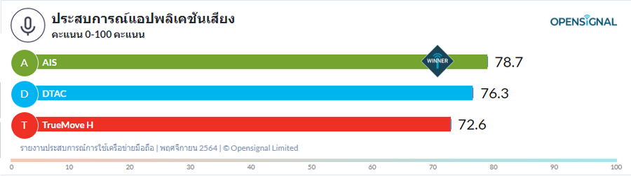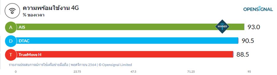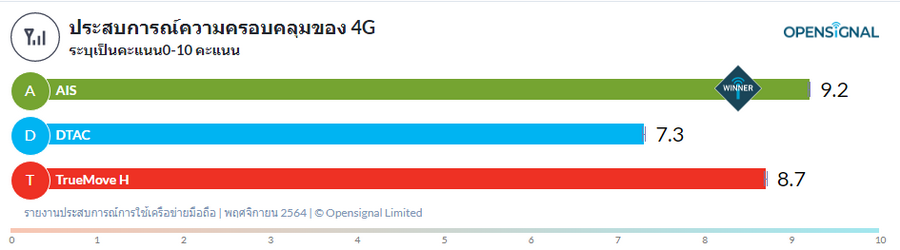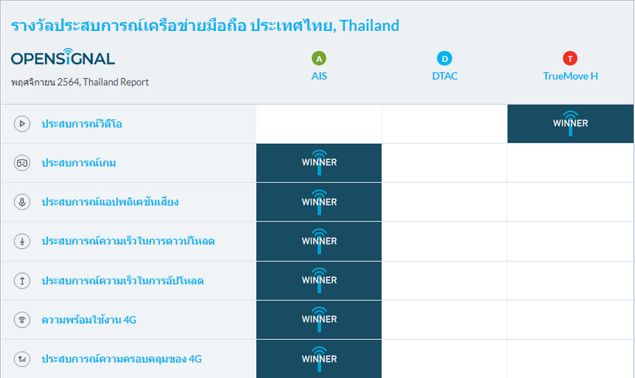 Opensignal ผู้ดำเนินการวิเคราะห์ระบบมือถือและกำหนดมาตรฐานระดับโลกเผยรายงานประสบการณ์เครือข่ายมือถือของประเทศไทยประจำเดือนพฤศจิกายน 2564 ฉบับที่ 9 พบว่า AIS ครองรางวัลทั้งหมด 6 หมวดหมู่ด้วยกัน นับเป็นผู้ให้บริการที่ได้รับรางวัลมากที่สุดในบันทึกรายงานของประเทศไทย หลังจากเพิ่มความเร็วจนเป็นที่น่าประทับใจแก่ผู้ใช้งานแล้ว AIS ยังได้รับรางวัลด้านความเร็วอีก 2 หมวดหมู่ ได้แก่ ประสบการณ์ความเร็วในการดาวน์โหลดและความเร็วในการอัปโหลด ทิ้งห่างจากผู้ชนะเดิมอย่าง TrueMove H โดยผู้ให้บริการรายนี้ยังครองความเป็นหนึ่งในด้านประสบการณ์เกม ประสบการณ์แอปพลิเคชั่นเสียง ความพร้อมใช้งาน 4G และความครอบคลุมของ 4G สำหรับรางวัลประสบการณ์วิดีโอนับเป็นรางวัลเดียวที่ AIS พลาดไป โดย TrueMove H ยังคงรั้งรางวัลนี้ไว้ได้อย่างเหนียวแน่น