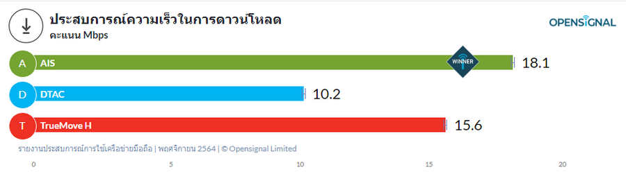 AIS คว้ารางวัลประสบการณ์ความเร็วในการดาวน์โหลดหลังจากเพิ่มความเร็วได้อย่างน่าทึ่ง ซึ่ง AIS ไม่เคยได้รับรางวัลด้านความเร็วจาก Opensignal มาก่อน แต่สิ่งนี้ทำให้ผู้ใช้ AIS ได้เห็นศักยภาพความเร็วเฉลี่ยที่เร็วที่สุดในประเทศไทยทั้งการดาวน์โหลดและการอัปโหลด AIS คว้ารางวัลด้านประสบการณ์ความเร็วในการดาวน์โหลดกลับบ้านด้วยการเพิ่มความเร็วถึง 10.4 Mbps ให้กับผู้ใช้งานซึ่งช่วยให้ค่ายนี้ขยับจากที่สามขึ้นมาเป็นที่หนึ่ง ความเร็วของ AIS คือ 18.1 Mbps ซึ่งสูงกว่าจากรายงานครั้งที่แล้วของเราถึงสองเท่าและมากกว่า TrueMove H ผู้ชนะจากครั้งที่แล้วถึง 2.6 Mbps (16.4%)