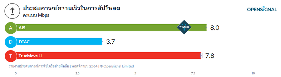 นับเป็นครั้งแรกที่ AIS ได้รับรางวัลด้านประสบการณ์ความเร็วในการอัปโหลด เช่นเดียวกับรางวัลประสบการณ์ความเร็วในการดาวน์โหลด AIS สามารถคว้ารางวัลประสบการณ์ความเร็วในการอัปโหลดได้เป็นครั้งแรก หลังจากความเร็วที่เพิ่มขึ้นอย่างน่าประทับใจเมื่อเทียบกับรายงานในครั้งก่อนหน้า ผู้ใช้งานของเราบนเครือข่าย AIS ได้สัมผัสประสบการณ์ความเร็วเฉลี่ยในการอัปโหลดที่เพิ่มขึ้นมากถึง 70% ด้วยความเร็ว 8 Mbps จึงทำให้ AIS ขึ้นมาอยู่ในอันดับที่ 1 ทำให้ชนะความเร็วในการอัปโหลดเฉลี่ยของ TrueMove H เจ้าของรางวัลครั้งที่แล้วไปที่ 0.2 Mbps