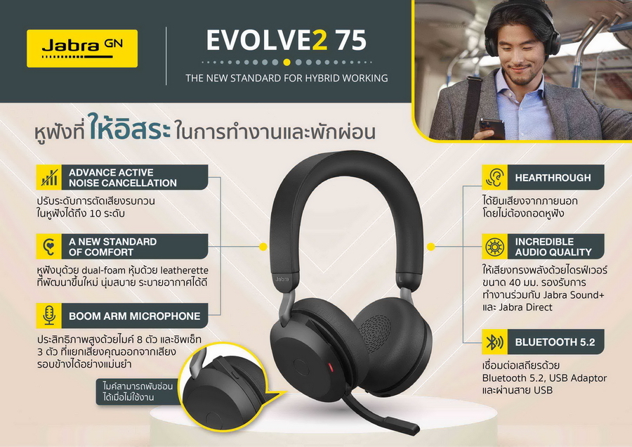 สำหรับ Jabra Evolve2 75 เป็นหูฟังไร้สายแบบครอบหูระดับพรีเมี่ยมของตระกูล Evolve ที่ออกแบบมาเป็นพิเศษเพื่อการทำงานจากต่างที่ได้ที่ไหนก็ไหนอย่างสะดวกสบายและให้ประสิทธิภาพที่ดียิ่งขึ้น ด้วยเทคโนโลยีตัดเสียงระบบแบบรบกวน Active Noise Cancellation (ANC) ที่สามารถปรับระดับเสียงรอบข้างได้ตามต้องการ ทำให้เสียงมีความคมชัดกว่าหูฟังรุ่น Evolve เดิมถึง 26% จึงช่วยสร้างสมาธิในการทำงานมากขึ้น รวมถึงมีฟังก์ชั่น HearThrough ที่ทำให้ได้ยินเสียงจากภายนอกโดยไม่ต้องถอดหูฟังให้เสียเวลา ช่วยให้ไม่พลาดการติดต่อประสานงานในที่ทำงาน และปลอดภัยเมื่ออยู่ภายนอก