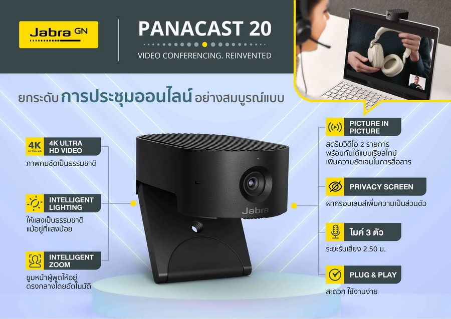 Jabra PanaCast 20 เป็นกล้องวิดีโอคอนเฟอร์เรนซ์อัจฉริยะระดับพรีเมี่ยมที่ออกแบบมาเพื่อยกระดับประสบการณ์ในการประชุมออนไลน์แบบส่วนตัวอย่างสมบูรณ์แบบและให้ความปลอดภัยอย่างมาก ด้วยสุดยอดระบบประมวลผลภาพอันทรงพลัง พร้อมด้วย AI ตรวจจับภาพอัตโนมัติ และเทคโนโลยีบันทึกภาพในให้ภาพคมชัดด้วยความละเอียดระดับ 4k ที่มีความละเอียด 13 เมกกะพิกเซล เพื่อให้สามารถจับภาพได้อย่างรวดเร็ว และคมชัด ทั้งยังมาพร้อมระบบซูมอัจฉริยะที่ขับเคลื่อนด้วย AI ที่จะช่วยซูมภาพผู้พูดระหว่างประชุมให้อยู่ตรงกลางและเหมาะสมที่สุดโดยอัตโนมัติไม่ว่าจะนั่งอยู่มุมใดในห้อง ขณะเดียวกันยังให้แสงที่เป็นธรรมชาติและคมชัดมากขึ้นไม่ว่าคุณจะนั่งทำงานอยู่ที่ใดก็ตาม หรือแม้กระทั่งในที่แสงน้อย ด้วย Intelligent Lighting จึงทำให้รู้สึกเหมือนทุกคนนั่งอยู่ในห้องเดียวกัน นอกจากนี้ ยังมีโหมด Picture in Picture ทำงานเพื่อฉายวิดีโอแบบซูม และภาพกว้างพร้อมกันแบบเรียลไทม์ เหมือนมีกล้องสองตัว ที่สำคัญยังมาพร้อมฝาครอบปิดเลนส์ และระบบประมวลผลข้อมูลจาก AI ในตัวกล้องเอง จึงมั่นใจได้ว่าสามารถป้องกันการละเมิดข้อมูลได้สูงสุด ทั้งยังรองรับการใช้งานได้กับแพลตฟอร์ม UC ชั้นนำ แถมใช้งานง่ายด้วยระบบ Plug and Play ที่สามารถติดตั้งได้หลากหลายรูปแบบ เพื่อให้ได้มุมกล้องที่เหมาะสมที่สุด ซึ่งมาพร้อมกระเป๋าพกพาที่สะดวกต่อการทำงานแบบ Hybrid และยังสามารถใช้งานร่วมกับหูฟังของจาบร้าได้หลากหลายรุ่น เช่น Evolve2 65 และ Speak 750 พร้อมวางจำหน่ายในราคา 11,770 บาท