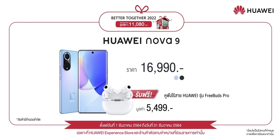 HUAWEI nova 9 วางจำหน่ายแล้วในราคา 16,990 บาท พร้อมโปรโมชันพิเศษรับปลายปี เมื่อซื้อสินค้าระหว่างวันที่ 1 ธันวาคม 2564 ถึง 31 ธันวาคม 2564 รับไปเลยหูฟังไร้สาย HUAWEI FreeBuds Pro มูลค่า 5,499 บาท ทางหน้าร้าน HUAWEI Experience Store ร้านค้าตัวแทนจำหน่ายที่ร่วมรายการทั่วประเทศ
