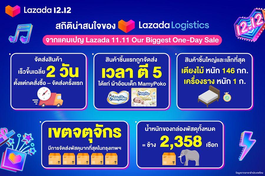 ลาซาด้า ผู้นำแพลตฟอร์มอีคอมเมิร์ซในเอเชียตะวันออกเฉียงใต้ ประกาศเดินหน้าพันธกิจในการลงทุนด้านโลจิสติกส์อย่างต่อเนื่อง เพื่อให้ธุรกิจเติบโตอย่างยั่งยืน และสร้างนิยามใหม่ให้แก่วงการโลจิสติกส์ไทย โดยลาซาด้า โลจิสติกส์ในประเทศไทยได้พัฒนาประสิทธิภาพการจัดส่งพัสดุและยกระดับประสบการณ์ช้อปของผู้บริโภคไปอีกขั้น ด้วยการใช้เทคโนโลยีคัดแยกสินค้าอัตโนมัติแบบใหม่ และขยายความสามารถในการคัดแยกพัสดุตั้งแต่เดือนกันยายนที่ผ่านมา เพื่อรองรับคำสั่งซื้อจำนวนมากในช่วงเมกะแคมเปญ ซึ่งแคมเปญ 11.11 ยังทุบสถิติจากทั่วภูมิภาคมียอดคำสั่งซื้อเพิ่มขึ้น 20 เท่าในช่วง 2 ชั่วโมงแรกของแคมเปญ เมื่อเทียบกับช่วงเวลาปกติ นอกจากนี้ ลาซาด้ายังจัดเต็มให้คนไทยได้ช้อปกันอย่างเพลิดเพลินส่งท้ายปีด้วยดีลที่ดีที่สุดในแคมเปญ "Lazada 12.12 Grand Year-End Sale เซลใหญ่ส่งท้ายปี" อีกด้วย