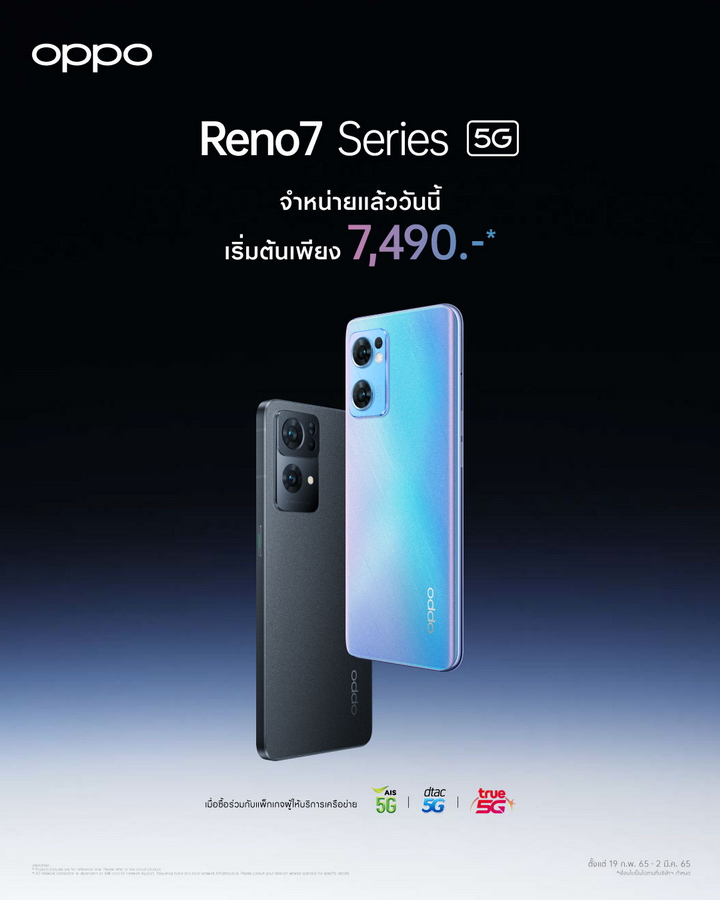 สามารถเป็นเจ้าของได้แล้ววันนี้ ณ OPPO Brand Shop และตัวแทนจำหน่ายทั่วประเทศ หรือสามารถเป็นเจ้าของได้ง่ายมากขึ้นเมื่อซื้อ OPPO Reno7 5G และ Reno7 Pro 5G ผ่านผู้ให้บริการเครือข่าย ในราคาเริ่มต้นเพียง 7,490 บาท ตั้งแต่วันนี้ ถึงวันที่ 2 มีนาคม 2565 โดยเงื่อนไขเป็นไปตามที่บริษัทฯ กำหนด