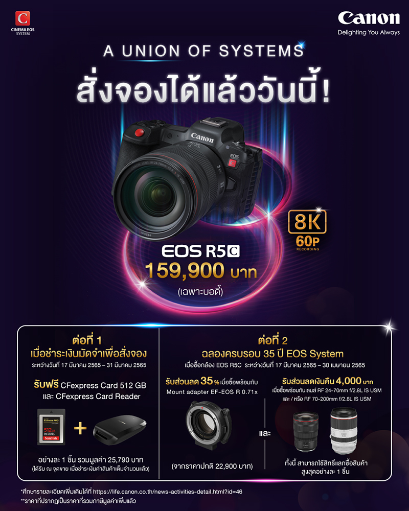 Canon EOS R5 C จะเริ่มวางจำหน่ายในประเทศไทยช่วงกลางเดือนมีนาคม 2565 ในราคาอย่างเป็นทางการ 159,900 บาท พร้อมโปรโมชั่นพิเศษสำหรับผู้ที่สั่งจองล่วงหน้าตั้งแต่วันที่ 17 – 31 มีนาคม 2565 จะได้รับฟรี CFexpress 512GB & CFexpress Card Reader (มูลค่า 25,790 บาท) และรับเพิ่มข้อเสนอพิเศษในโอกาสฉลองครบรอบ 35 ปี Canon EOS System เมื่อซื้อกล้อง Canon EOS R5 C หรือ Canon EOS C70 ภายในวันที่ 17 มีนาคม – 30 เมษายน 2565 ดังนี้