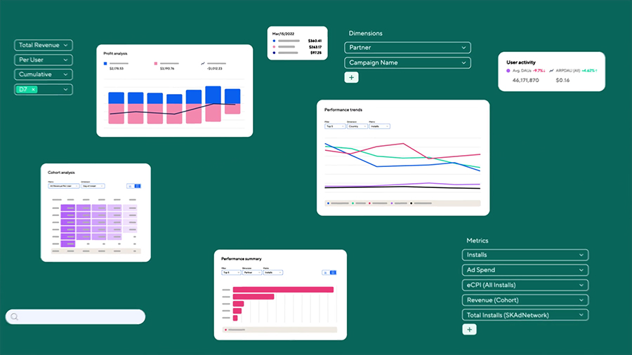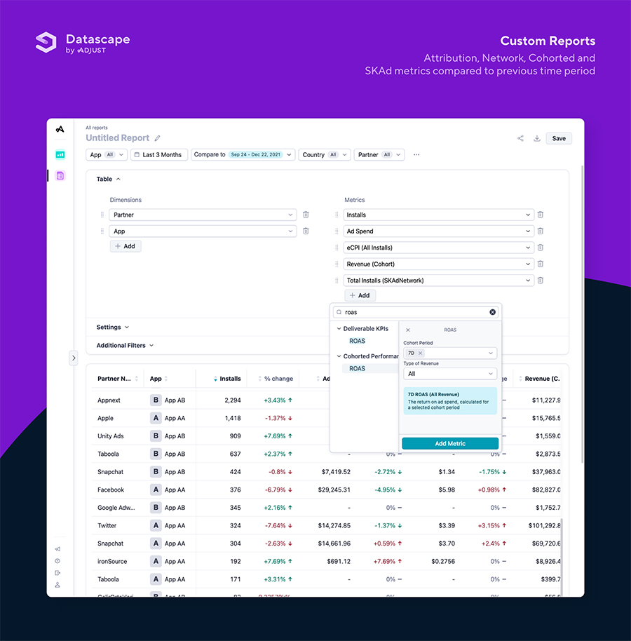 ภายใน Datascape นักการตลาดสามารถปรับแต่งแดชบอร์ดและรายงานเพื่อแสดงภาพการเติบโตของผู้ใช้และ Cohort สรุปชุดข้อมูลที่ครอบคลุม และวิเคราะห์ข้อมูล SKAN รวมถึงข้อมูลดังต่อไปนี้