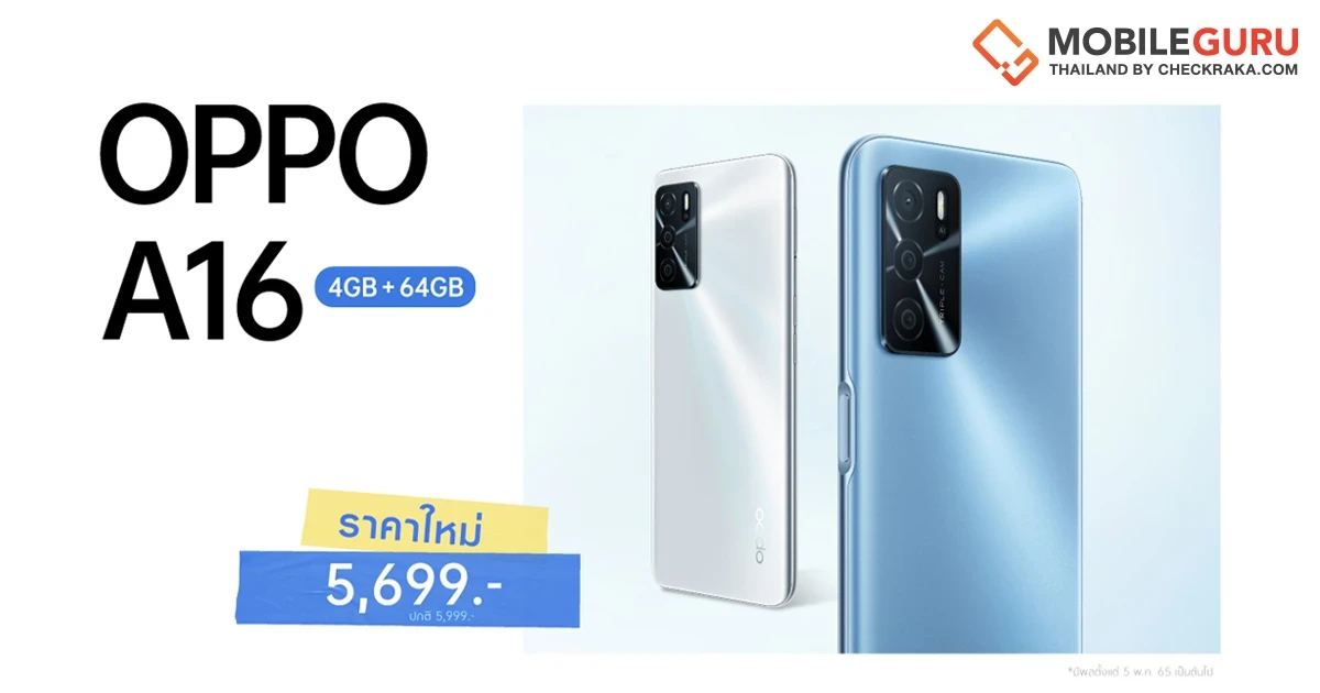 OPPO A16 รุ่น RAM 4GB + ROM 64GB สมาร์ตโฟนสุดคุ้ม เต็มอิ่มทุกเอ็นเตอร์เท็นเมนท์ พร้อมให้คุณใช้งานได้ง่ายดายยิ่งขึ้น มาพร้อมราคาใหม่เพียง 5,699 บาท จากปกติ 5,999 บาท ตั้งแต่วันที่ 5 พฤษภาคม 2565 เป็นต้นไป