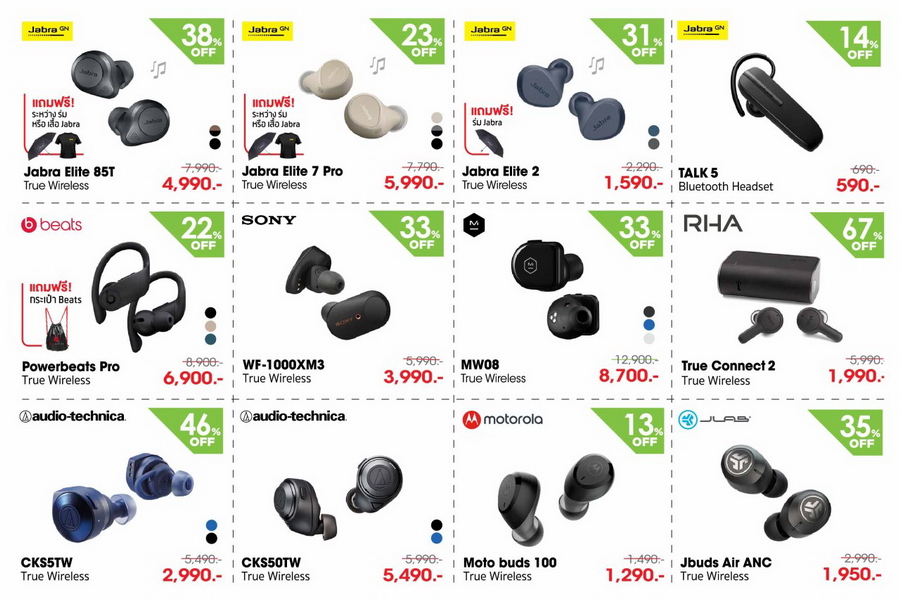 - หูฟัง Jabra รุ่น Elite 2 ราคาปกติ 2,290 บาท ราคาพิเศษ 1,590 บาท แถมฟรีร่มหรือเสื้อ Jabra