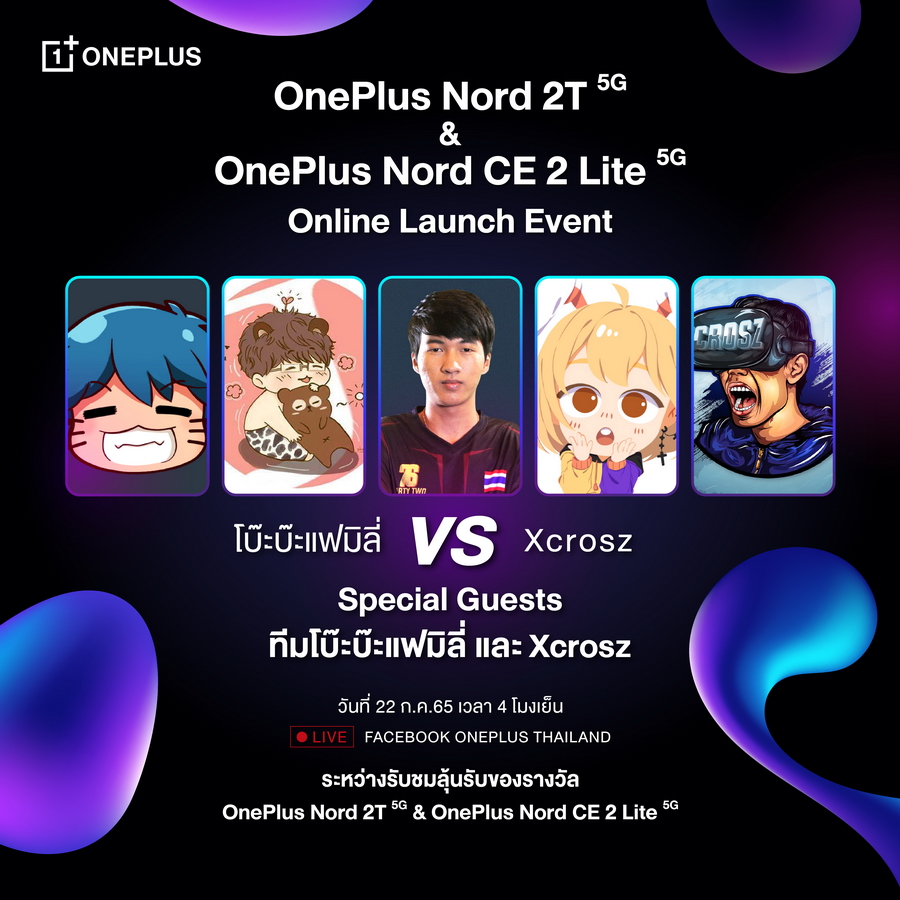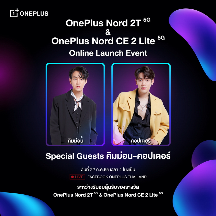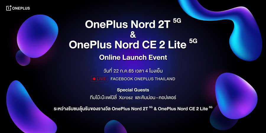 สำหรับแฟน ๆ ประเทศไทย เตรียมรับชมงานเปิดตัวในรูปแบบออนไลน์ของสองสมาร์ทโฟนรุ่นใหม่ OnePlus Nord 2T 5G และ OnePlus Nord CE 2 Lite 5G Online Launch Event พร้อมกันได้ ในวันศุกร์ ที่ 22 กรกฎาคม 2565 เวลา 16.00 น. ตามเวลาในประเทศไทย ผ่านการชมไลฟ์ได้ที่ช่องทาง Facebook page : OnePlus Thailand