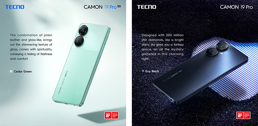 TECNO CAMON 19 PRO รุ่น 4G ใช้ชิปเซ็ต Helio G96 ให้ประสิทธิภาพ 4G ระดับไฮเอนด์ เชื่อมต่อเสถียรและเร็วที่สุด กล้องหลัง 3 ตัว 64 + 50MP+ 2MP กล้องหน้า 32MP Pro มีจำหน่ายเฉพาะสี Mondrian (มองเดรียน) ดีไซน์แบบรูปทรงลายเส้นเรขาคณิตสีขาวและจะเปลี่ยนเป็นหลากหลายสีเมื่อได้รับแสงแดดหรือแสงยูวี ซึ่งเป็น Art Limited Edition ที่เพิ่งได้รับรางวัล 2022 MUSE Design Award จาก International Awards Associate หรือ IAA ที่มหานครนิวยอร์ค สหรัฐอเมริกา เมื่อวันที่ 7 กรกฎาคม 2565 ที่ผ่านมา โดยเป็นสมาร์ทโฟนที่ TECNO ได้ทำการเปิดตัวร่วมกับพันธมิตรอย่างพิพิธภัณฑ์วิจิตรศิลป์บอสตัน (Museum of Fine Arts, Boston) อีกด้วย