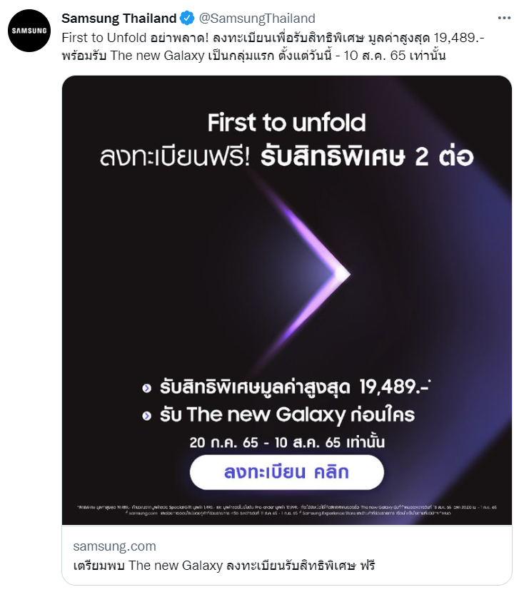 หากสงสัยว่าซัมซุงเนรมิตความเป็นไปได้เหล่านี้ขึ้นมาอย่างไร อย่าพลาด รับชมไลฟ์สตรีมมิ่งงาน Galaxy Unpacked ที่ Samsung.com และ Facebook Samsung ในวันที่ 10 สิงหาคม 2565 พร้อมกิจกรรมความสนุกจัดเต็มเพื่อแฟนๆ ชาวไทยตั้งแต่เวลา 19.30 น. และร่วมนับถอยหลัง Unfold Your World พร้อมกันทั่วโลกเวลา 20.00 น. เป็นต้นไป รับชมด้วยอรรถรสแบบเต็มอิ่มด้วยการแปลภาษาไทยควบคู่ตลอดไลฟ์