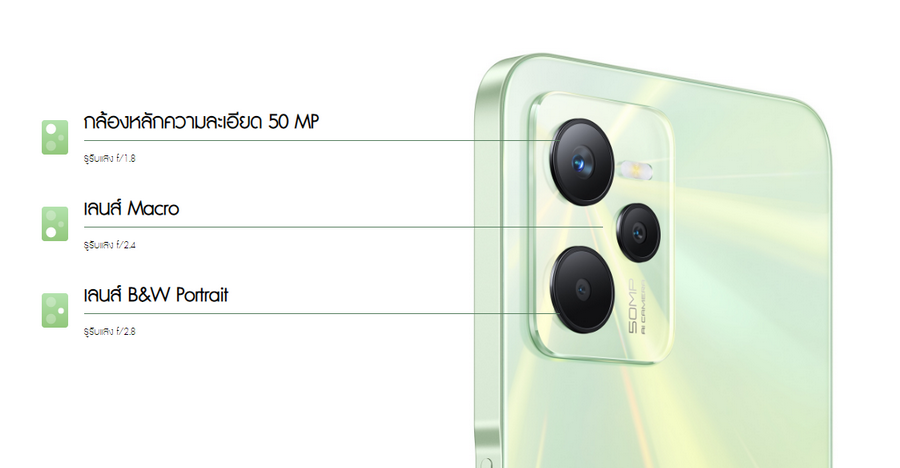 ฟังไม่ผิด! เพราะ realme C35 ให้สเปกกล้องหลักเทียบเท่ากับรุ่นท็อปของแบรนด์อย่าง GT2 Pro โดยให้เซ็นเซอร์ที่มีความละเอียดสูงถึง 50MP ทำให้เก็บแสงได้อย่างดีเยี่ยมแม้ถ่ายรูปในที่แสงน้อย แถมด้วยเลนส์ขาวดำ f/2.8 เพื่อการวัดค่าแสงที่แม่นยำและสร้างเอฟเฟ็กต์ที่สวยงามแปลกตาในโหมดถ่ายภาพบุคคล และเลนส์ f/2.4 สำหรับการถ่ายช็อตมาโครที่เข้าใกล้วัตถุได้ถึง 4 ซม. แค่นี้ก็ทำให้คุณถ่ายภาพได้คมชัดเสมือนกับรุ่นแฟล็กชิปราคาหลายหมื่น