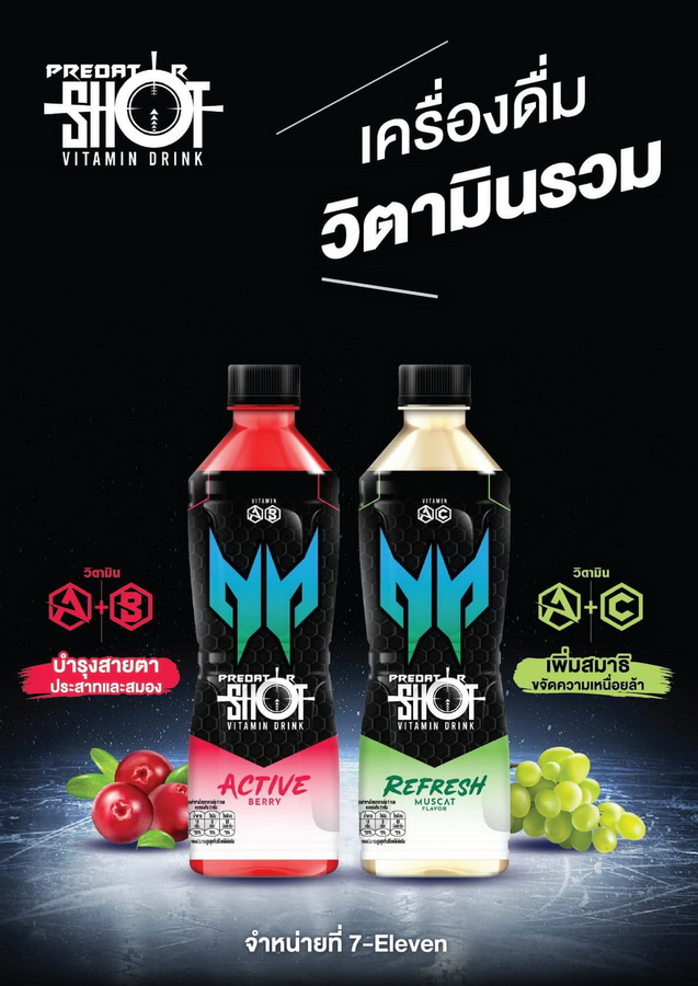 “PredatorShot” โดย บริษัท เอเซอร์ คอมพิวเตอร์ จำกัด ส่ง พรีเดเตอร์ช็อต วิตามิน ดริ้งก์ (PredatorShot Vitamin Drink) 2 รสชาติ วางจำหน่ายใน 7-Eleven ทุกสาขาทั่วประเทศ โฟกัสกลุ่มเกมเมอร์ คนทำงาน คนรุ่นใหม่ที่ใส่ใจสุขภาพด้วยคุณประโยชน์ของวิตามินเอ บีรวม และซี รวมถึงแอลทีอะนีน คาเฟอีนธรรมชาติจากชาเขียว พรีเดเตอร์ช็อต แอคทีฟ กลิ่นเบอรี่ (PredatorShot Vitamin Drink Active Berry) รสหวานอมเปรี้ยว หอมกลิ่นเบอรี่ มีส่วนผสมของวิตามินเอ วิตามินบีรวม สดชื่นด้วยคาเฟอีนธรรมชาติจากชาเขียว พรีเดเตอร์ช็อต รีเฟรช กลิ่นองุ่นมัสแคท (PredatorShot Vitamin Drink Refresh Muscat) รสเปรี้ยวหวาน หอมชื่นใจ อุดมด้วยส่วนผสมวิตามินเอ วิตามินซี และแอลทีอะนีน จำหน่ายในขวดปริมาณ 420 มิลลิลิตร ราคาขวดละ 20 บาท