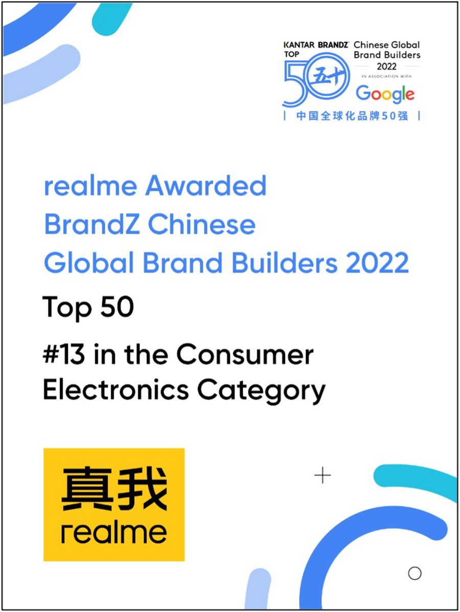 realme แบรนด์เทคโนโลยีและผู้นำเทรนด์ของคนรุ่นใหม่ที่เติบโตเร็วที่สุดในโลก ได้รับการจัดอันดับเป็นครั้งแรกในรายชื่อ 50 อันดับสุดยอดแบรนด์ดังระดับโลก "Kantar BrandZ Chinese Global Brand Builders 2022 TOP 50" ซึ่งจัดทำโดย