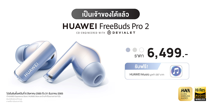 HUAWEI FreeBuds Pro 2 มีให้เลือก 3 สี 3 สไตล์ คือ สีฟ้า Silver Blue, สีเงิน Silver Frost และสีขาว Ceramic White เปิดราคาในประเทศไทยเพียง 6,499 บาท พร้อมโปรโมชันสุดคุ้มในวันแรกที่วางจำหน่าย 6 สิงหาคม 2565 รับฟรี! HUAWEI Band 6 มูลค่า 1,899 บาท และ HUAWEI Music Premium ฟรี 3 เดือน มูลค่า 387 บาท เมื่อซื้อสินค้าที่หน้าร้าน HUAWEI Experience Store และร้านค้าที่ร่วมรายการ หรือรับฟรีบริการ HUAWEI Music Premium ฟรี 3 เดือน มูลค่า 387 บาท เมื่อซื้อสินค้าวันที่ 7 สิงหาคม 2565 เป็นต้นไป ทั้งหน้าร้านและเมื่อสั่งซื้อที่ช่องทางออนไลน์
