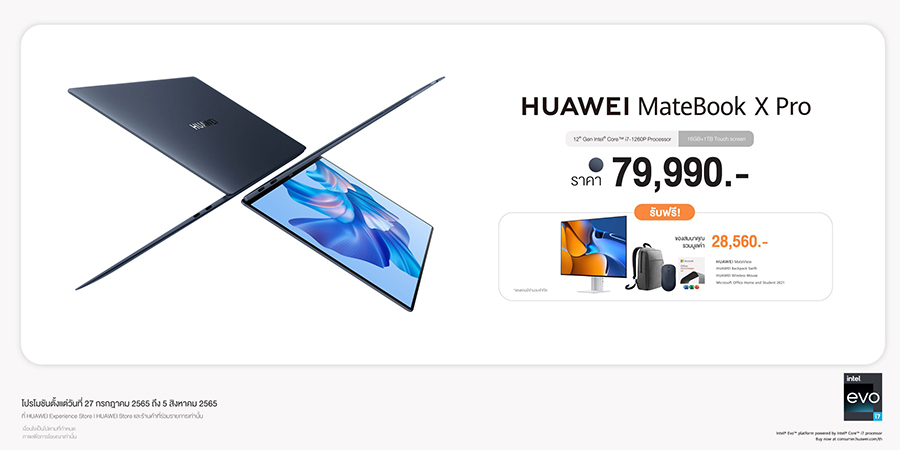 HUAWEI MateBook X Pro วางจำหน่ายในประเทศไทยที่ราคา 79,990 บาท พิเศษสุดๆ กับโปรโมชันพรีออเดอร์ระหว่างวันที่ 27 กรกฎาคม - 5 สิงหาคม 2565 รับฟรี! ของสมนาคุณมูลค่ารวม 28,560 บาท ได้แก่ HUAWEI MateView มูลค่า 22,990 บาท Microsoft Office Home & Student 2021 (เวอร์ชันใช้งานตลอดชีพ) มูลค่า 3,390 บาท HUAWEI Wireless Mouse สีน้ำเงิน มูลค่า 1,090 บาท และ HUAWEI Backpack Swift มูลค่า 1,090 บาท โดยสามารถสั่งจองได้ที่หน้าร้าน HUAWEI Experience Store และร้านค้าที่ร่วมรายการ รวมถึงช่องทางออนไลน์