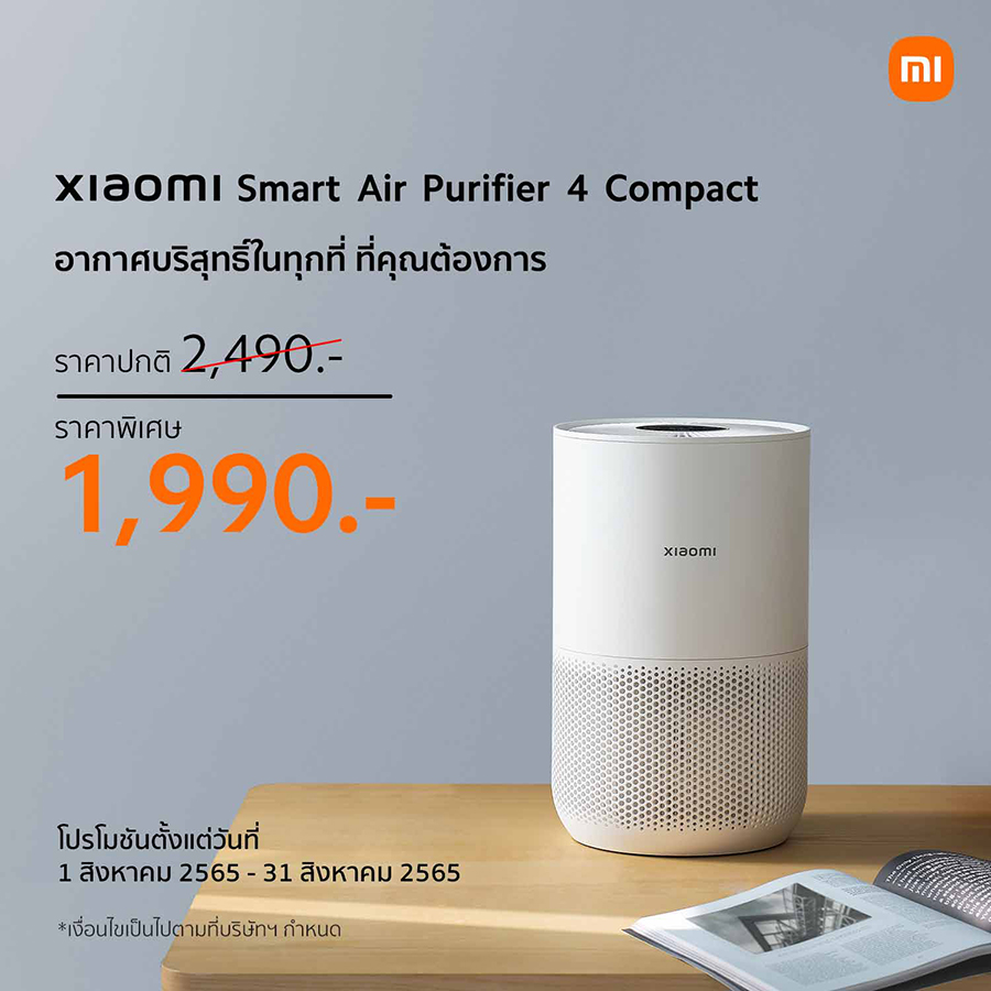 เครื่องฟอกอากาศ Xiaomi Smart Air Purifier 4 Compact วางจำหน่ายในราคา 2,490 บาท พิเศษ! สำหรับลูกค้าที่ซื้อในระหว่างวันที่ 8 - 31 สิงหาคม 2565 สามารถหาซื้อได้ในราคาพิเศษเพียง 1,990 บาท ที่ Xiaomi Store และร้านตัวแทนจำหน่ายที่ร่วมรายการ