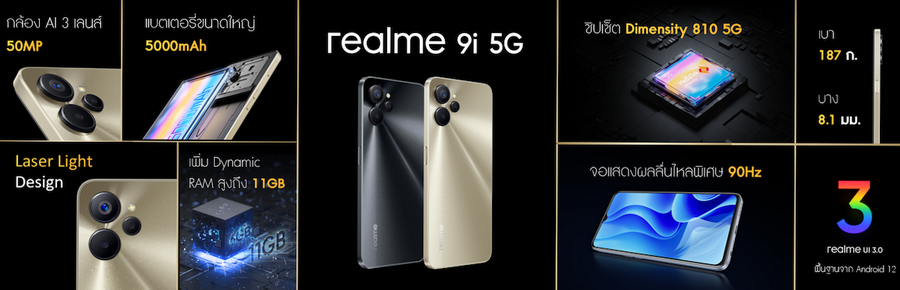 realme แบรนด์สมาร์ตโฟนเพื่อคนรุ่นใหม่ที่เติบโตเร็วที่สุดในโลก จัดงานเปิดตัวสุดยอดสมาร์ตโฟนแห่งปีกับ “realme 9i 5G The Rock Star” สมาชิกใหม่ในตระกูล Number Series ที่แฟนเรียลมีทั่วโลกจับตามองมากที่สุด ด้วยดีไซน์ที่มีสไตล์ที่สุดโดยนำเสนอผ่านความหรูหราเพรียวบางพร้อมความงามของโทนสีทองวินเทจแนวใหม่ พร้อมตอบโจทย์ทุกไลฟ์สไตล์การใช้งานด้วยขุมพลังชิปเซ็ต Dimensity 810 5G แบตเตอรี่ยักษ์ความจุ 5,000mAh และกล้อง 50MP AI Triple Camera ไม่เพียงเท่านั้นยังมาพร้อมกับสมาร์ตโฟนน้องเล็กของค่ายที่อัปเกรดใหม่ให้คุ้มยิ่งกว่าเดิมกับ realme narzo 50i Prime สมาร์ตโฟนสุดคุ้มค่าด้วยดีไซน์และฟีเจอร์ที่ดีที่สุดในระดับเดียวกัน