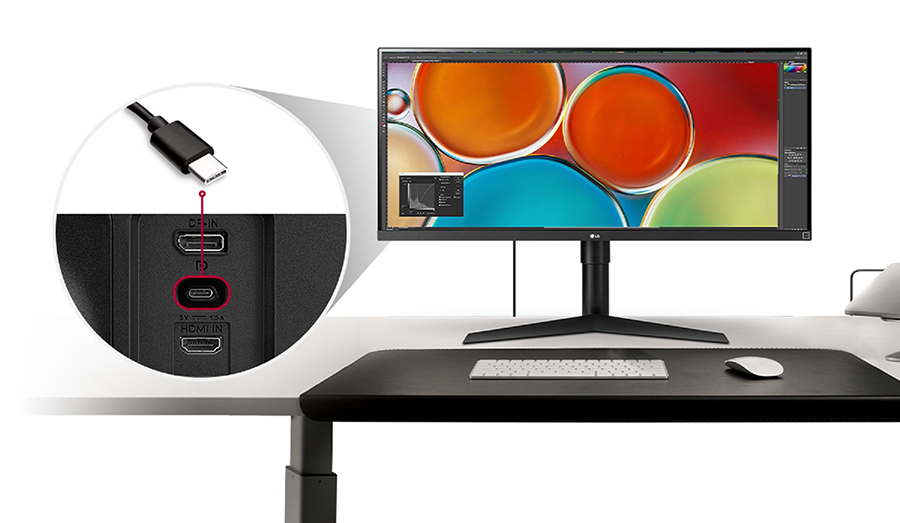 ผู้ใช้งานหน้าจอมอนิเตอร์ LG UltraWide™ 34WP65G ยังสะดวกสบายไปกับตัวเลือกการเชื่อมต่อที่ราบรื่น ด้วยพอร์ต USB Type-C™ ที่รองรับโหมด DisplayPort Alt เพียงใช้สาย USB Type-C™ เส้นเดียวก็สามารถถ่ายโอนสัญญาณภาพ DisplayPort แบบเต็มรูปแบบไปยังจอภาพภายนอกได้โดยไม่ต้องใช้สายแสดงผลเฉพาะหรืออะแดปเตอร์ที่ทำงานอยู่