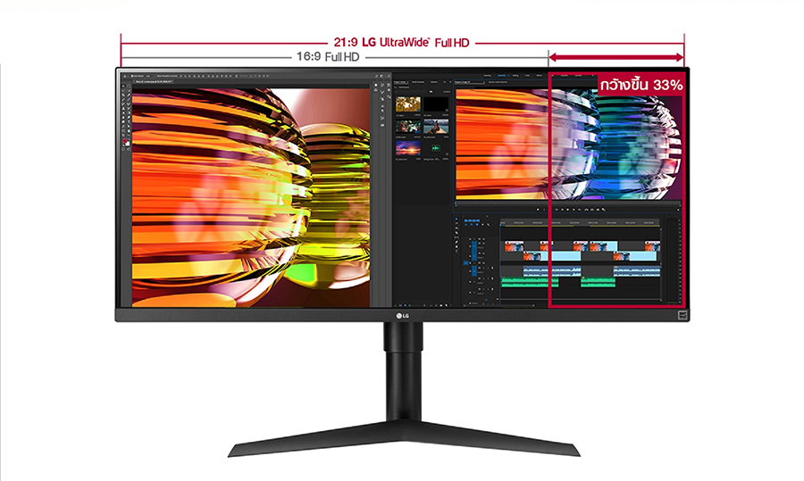 ด้วยจอแสดงผลขนาด 34 นิ้วที่มีอัตราส่วนภาพ 21:9 พร้อมขอบจอบางเฉียบทั้ง 4 ด้าน ให้มุมมองที่กว้างขึ้นเมื่อเทียบกับหน้าจอ FHD ทั่วไป หน้าจอมอนิแตอร์ LG UltraWide™ 34WP65G สามารถเพิ่มพื้นที่การทำงานมากขึ้นถึง 33% ทำให้คุณจัดการหน้าจอสำหรับการทำงานที่หลากหลายในเวลาเดียวกัน ไม่ว่าจะเป็น การประชุม การดูเอกสารข้อมูล สไลด์ หรือใช้งานโปรแกรมประชุมออนไลน์ วิดีโอคอล ในหน้าจอเดียวกันโดยไม่ต้องกด Alt-Tab ในทุกครั้งที่ต้องการสลับหน้าจอ