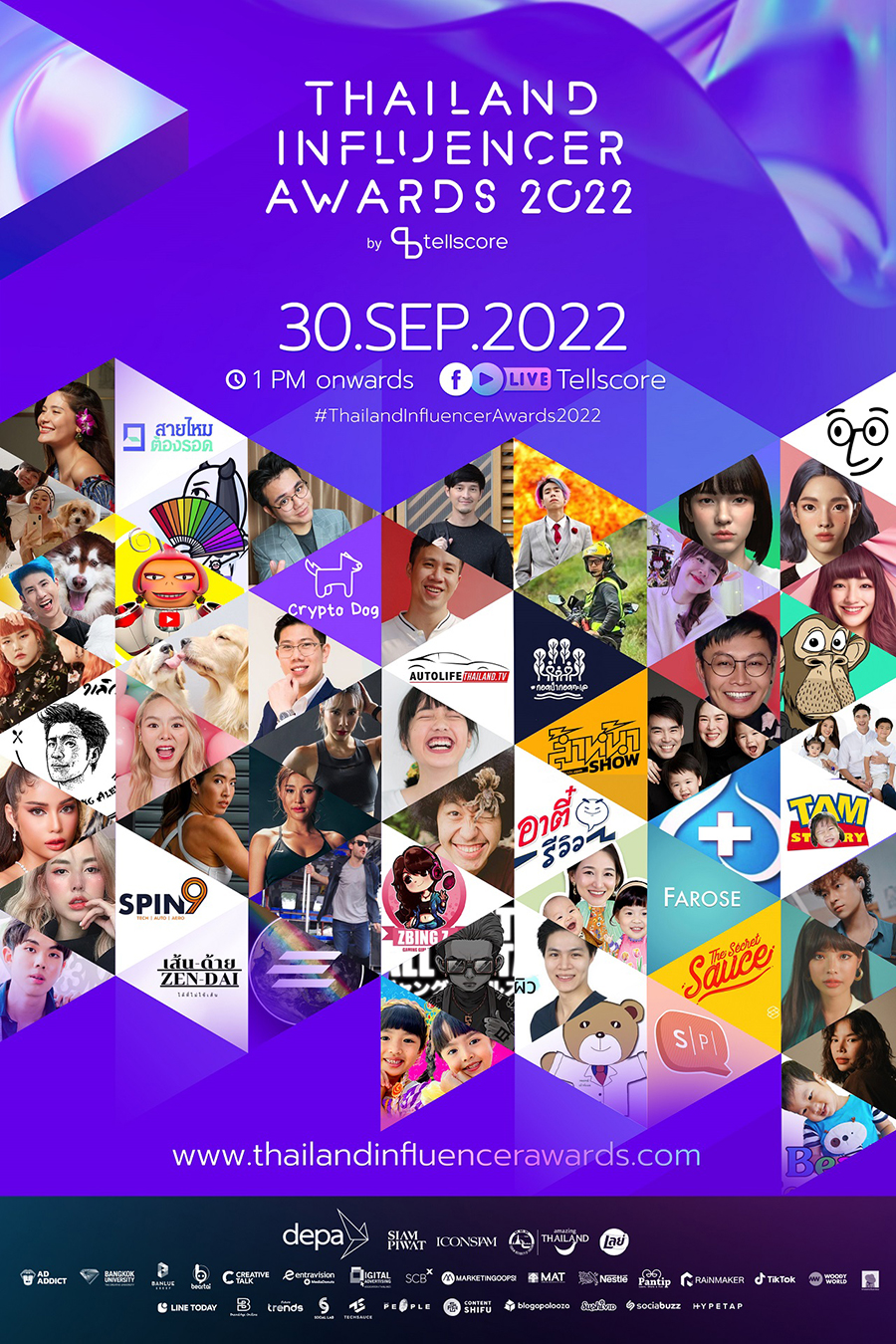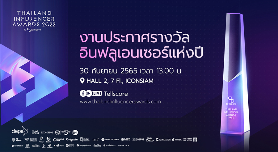 บริษัท เทลสกอร์ จำกัด (Tellscore) หนึ่งในผู้นำด้าน Influencer Marketing เตรียมพร้อมจัดงาน Thailand Influencer Awards 2022 งานประกาศรางวัลอย่างเต็มรูปแบบ ภายใต้แนวคิด "F O R W A R D" Looking Forward >> Thinking Forward >> Moving Forward เดินไปข้างหน้าอย่างไร้ขีดจำกัด เรียนรู้จากการเปลี่ยนแปลงแบบ Fast Forward โดยงานจัดขึ้นเพื่อประกาศผลและมอบรางวัลให้กับผู้ทรงอิทธิพลทางความคิด หรืออินฟลูเอนเซอร์คุณภาพในวงการดิจิทัล พร้อมมุ่งผลักดันและสนับสนุนให้กลุ่มอินฟลูเอนเซอร์มีกำลังใจในการพัฒนาสร้างสรรค์ผลงานที่ดี โดยปีนี้มีไฮไลต์น่าสนใจด้วยการเพิ่มสาขารางวัลอินฟลูเอนเซอร์ยอดเยี่ยมใหม่เพิ่มเติม 4 สาขารางวัล และการเสวนาในหัวข้อพิเศษ How is NFT Shaping the Content Creator Economy และ The Shaping of Asia Pacific Influencer Economy โดยผู้นำตลาดอินฟลูเอนเซอร์มาร์เก็ตติ้งจาก 5 ประเทศ ได้แก่ ไทย ฟิลิปปินส์ มาเลเซีย ออสเตรเลีย และอินโดนีเซีย