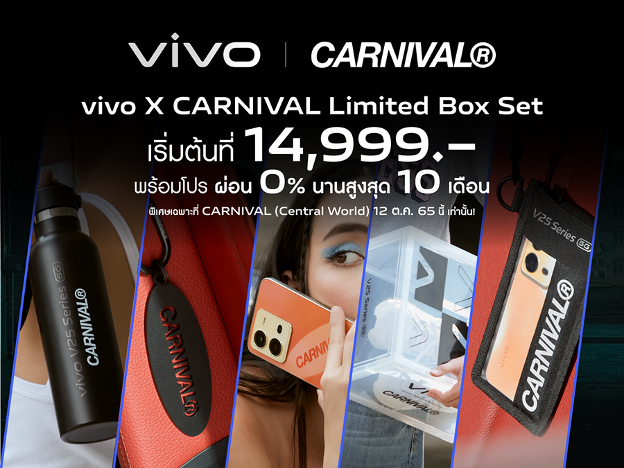 โดยสินค้าในคอลเลกชันสุดเอ็กคลูซีฟ vivo x CARNIVAL Limited Box Set ประกอบไปด้วย กล่องรองเท้าสนีกเกอร์ กระบอกน้ำเก็บอุณหภูมิสุดฮิต กระเป๋าใส่โทรศัพท์มือถือ และพวกกุญแจลาย CARNIVAL มีลูกเล่นคู่กับเทคโนโลยี Color-Changing Glass ของฝาหลังเครื่อง V25 series 5G ในจำนวนจำกัด! สำหรับลูกค้าที่ซื้อสมาร์ตโฟนสุดพรีเมียมรุ่นใหม่ล่าสุดให้เป็นเจ้าของฟรี รวมถึงร่วมลุ้นรับรางวัลพิเศษอื่นอีกมากมาย เฉพาะวันที่ 12 ตุลาคม 2565 นี้เท่านั้น ในงาน vivo x CARNIVAL Exclusive Event ที่ CARNIVAL เซ็นทรัลเวิลด์