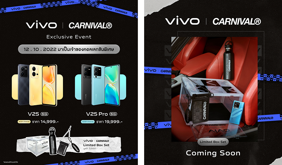โดยสินค้าในคอลเลกชันสุดเอ็กคลูซีฟ vivo x CARNIVAL Limited Box Set ประกอบไปด้วย กล่องรองเท้าสนีกเกอร์ กระบอกน้ำเก็บอุณหภูมิสุดฮิต กระเป๋าใส่โทรศัพท์มือถือ และพวกกุญแจลาย CARNIVAL มีลูกเล่นคู่กับเทคโนโลยี Color-Changing Glass ของฝาหลังเครื่อง V25 series 5G ในจำนวนจำกัด! สำหรับลูกค้าที่ซื้อสมาร์ตโฟนสุดพรีเมียมรุ่นใหม่ล่าสุดให้เป็นเจ้าของฟรี รวมถึงร่วมลุ้นรับรางวัลพิเศษอื่นอีกมากมาย เฉพาะวันที่ 12 ตุลาคม 2565 นี้เท่านั้น ในงาน vivo x CARNIVAL Exclusive Event ที่ CARNIVAL เซ็นทรัลเวิลด์