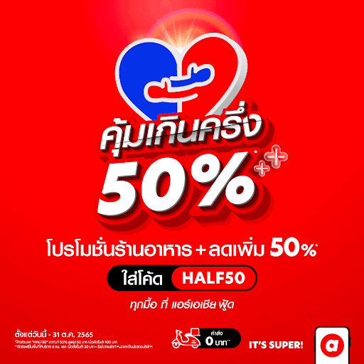 - แคมเปญ “คุ้มเกินครึ่ง” airasia food สนับสนุนช่วยลดค่าครองชีพ ด้วยการมอบส่วนลดค่าอาหารแบบคุ้มเกินครึ่งถึง 50 % เพียงใส่โค้ด “HALF50” เมื่อสั่งซื้อขั้นต่ำครบ 100 บาท ไม่จำกัดจำนวนครั้งตลอดเดือนตุลาคมนี้ พร้อมโปรส่งฟรี 6 กิโลเมตรแรก เมื่ออาหารจากร้านค้าในพื้นที่ให้บริการขั้นต่ำ 50 บาท