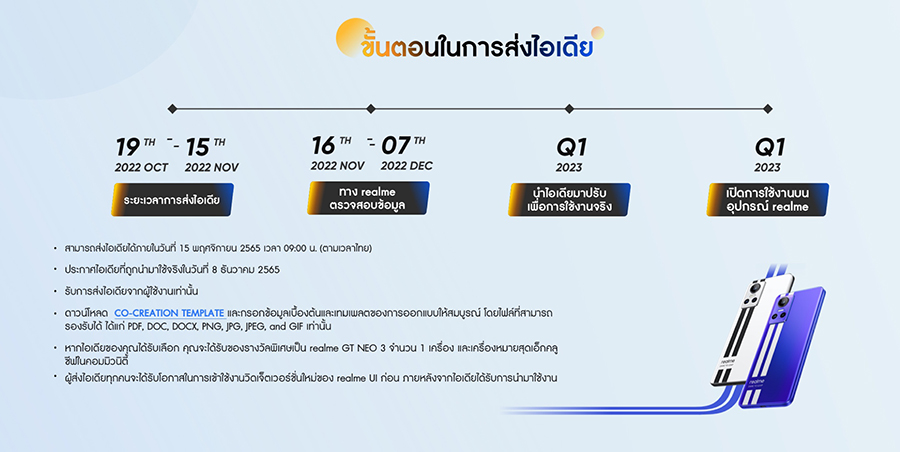 โครงการเปิดรับสมัครผลงานตั้งแต่วันที่ 19 ตุลาคม 2565 และปิดรับในวันที่ 15 พฤศจิกายน 2565 ประกาศผลไอเดียที่ผ่านการคัดเลือกเพื่อนำไปใช้งานจริงในวันที่ 8 ธันวาคม 2565 โดยเจ้าของไอเดียที่ได้รับเลือกยังมีสิทธิ์ลุ้นรับสมาร์ตโฟน realme GT NEO 3 และเข็มกลัดตรา Exclusive realme Community
