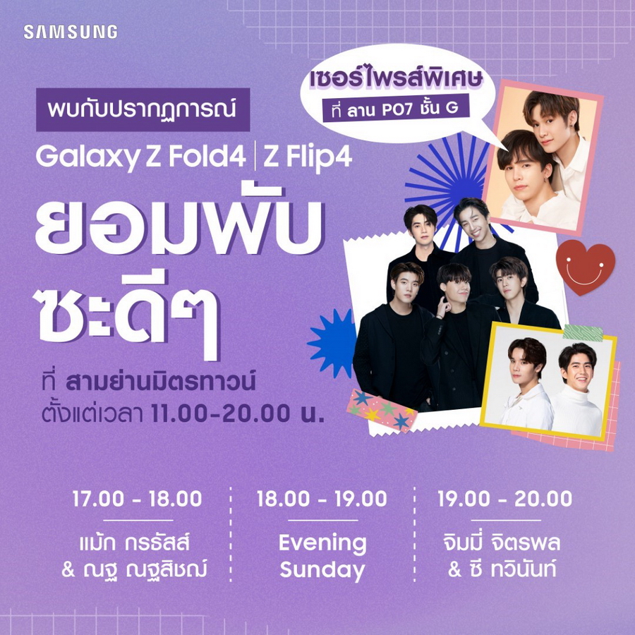 Samsung Galaxy Z Fold4 I Z Flip4 ชวนทุกคนสร้างปรากฎการณ์ยอมพับซะดีๆ ในงาน Flip Phenomenon ที่สามย่านมิตรทาวน์ ลาน PO7 ชั้น G ในวันที่ 28 ตุลาคมนี้ เวลา 11.00 - 20.00 น. พร้อมชมโชว์สุดพิเศษและกิจกรรมสุดเซอร์ไพรส์ โดยนักร้องนักแสดงวัยรุ่นสุดป๊อป แม้ก กรธัสส์ และ ณฐ ณฐสิชฌ์ นักแสดงจากซีรีส์สุดฮิต นิ่งเฮียก็หาว่าซื่อ, วง Evening Sunday ร่วมกับ จิมมี่ จิตรพล และ ซี ทวินันท์ นักแสดงนำจากซีรีส์ดัง Vice Versa รักสลับโลก อย่าลืมมาพับกันให้สนั่นเมือง!