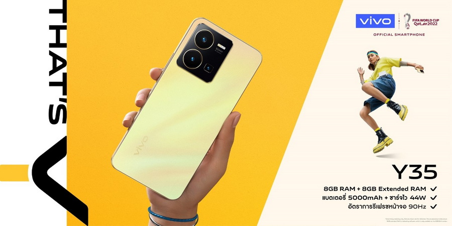 vivo แบรนด์สมาร์ตโฟนชั้นนำระดับโลก เปิดตัว vivo Y35 สมาร์ตโฟนรุ่นใหม่ล่าสุดจากตระกูล Y series อย่างเป็นทางการแล้วในประเทศไทย จัดเต็มกับประสิทธิภาพการทำงานขั้นสุดด้วยเทคโนโลยี Extended RAM ที่สามารถขยายได้สูงสุดถึง 8GB สำหรับการใช้งานไหลลื่นกว่าที่เคย หมดกังวลเรื่องความต่อเนื่องในการใช้งานด้วยแบตเตอรี่ความจุถึง 5,000 mAh รองรับเทคโนโลยีชาร์จไว 44W มาพร้อมกับจอแสดงผล FHD+ ขนาด 6.58 นิ้ว พร้อมรีเฟรชเรทสูงถึง 90Hz มอบประสบการณ์การใช้งานที่ไหลลื่นไม่มีสะดุด เพื่อการใช้งานอย่างยาวนานกว่าที่เคย พร้อมวางจำหน่ายในที่ราคา 8,999 บาท